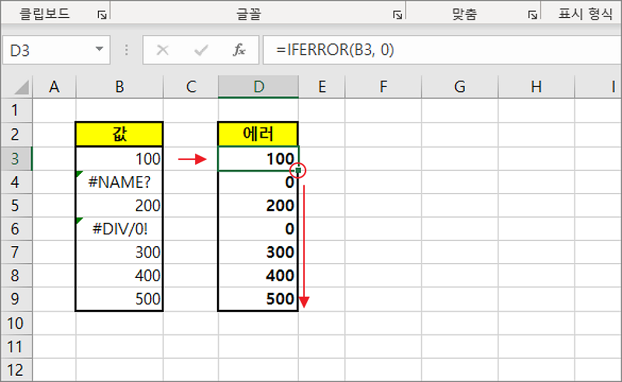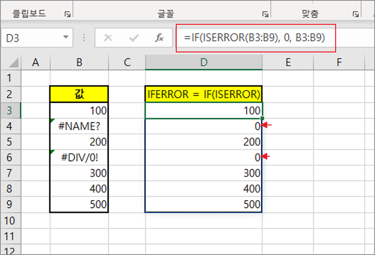 ▼ IFERROR 의 첫 번째 매개변수로 입력한 값이 오류인 경우 두 번째 매개변수로 입력한 0 을 출력합니다. 만약 에러가 없는 경우 해당 값을 그대로 출력합니다.