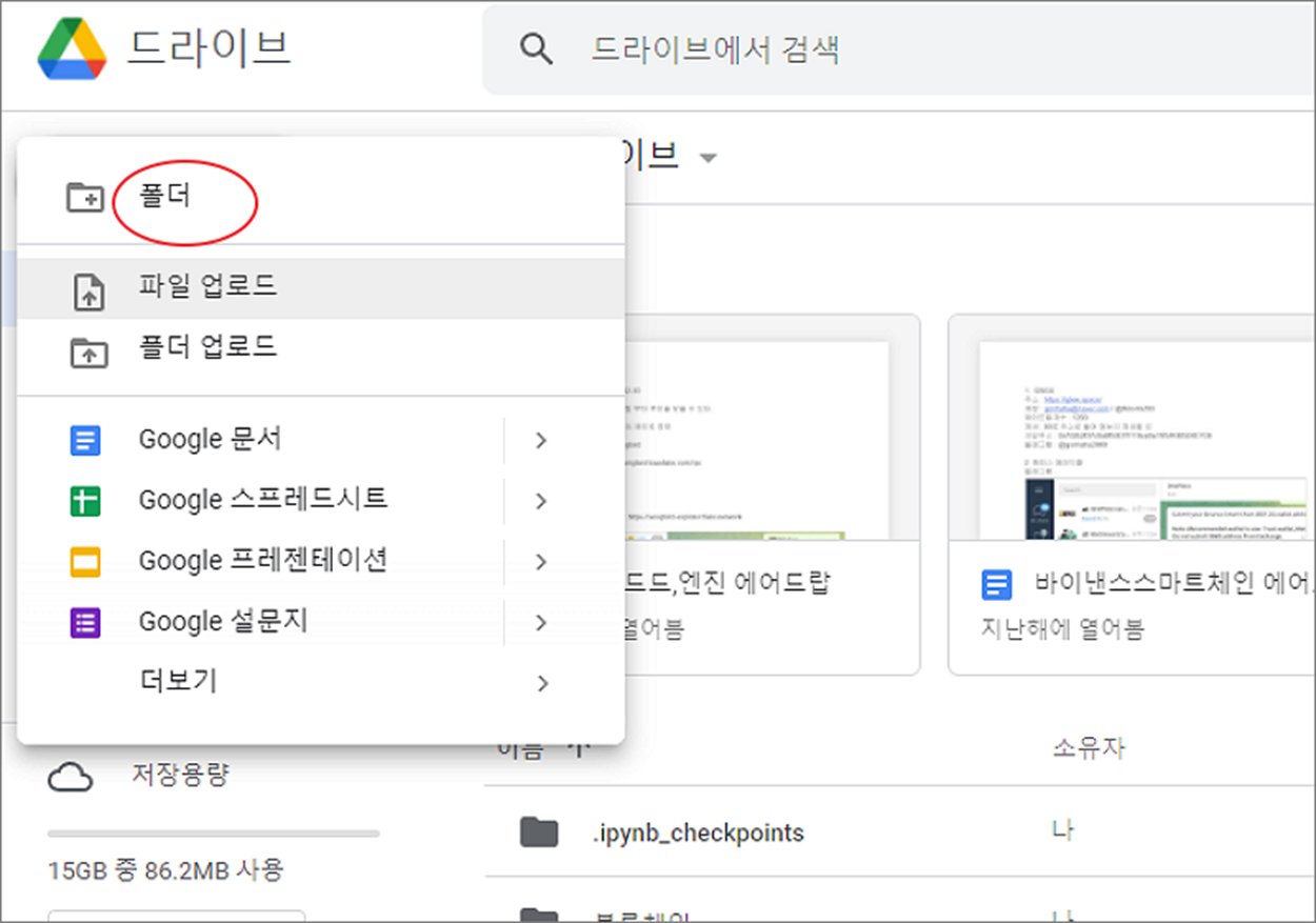 ▼ 드라이브에 메인 페이지로 이동해서 공유 파일을 관리할 폴더를 별도로 생성해 보겠습니다. 왼쪽 상단 메뉴 목록에서 새로 만들기 를 클릭합니다.