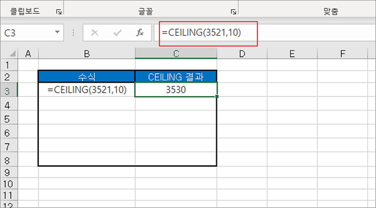▼ CEILING 는 원하는 배수만큼 올림할 수 있는 함수입니다. 예를 들어 3521원짜리 제품 가격을 1원이 아닌 10원 단위로 만들고 싶을 때 사용할 수 있습니다. 그림처럼 CELING 함수 적용결과 10단위인 3530 가 되었습니다.