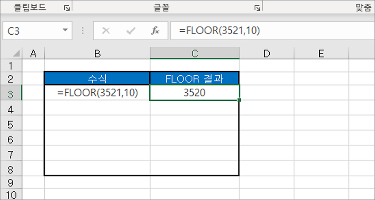▼ FLOOR 은 CEILING 과 반대로 내림한 결과값을 반환하는 함수입니다. 두 번째 매개변수로 입력하는 값만큼 내림하는 함수입니다. 결과는 10 단위의 가장 가까운 값으로 내림한 3520 을 반환했습니다. 형식은 다음과 같습니다.