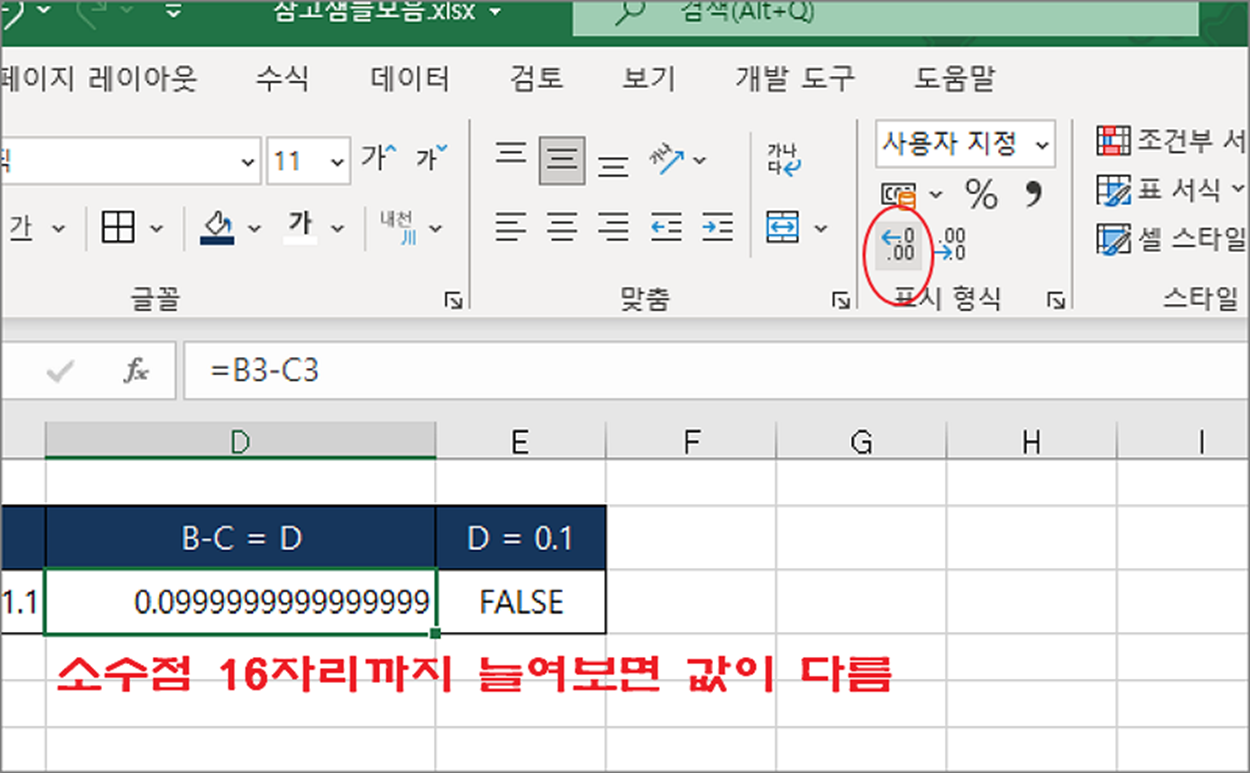 ▼ B 와 C 열에 있는 값을 빼서 D 값 0.1 나왔습니다. 계산 결과를 0.1 과 등호로 비교하니 결과가 FALSE 가 나타났습니다. 이것은 두 값이 같지 않다는 의미입니다. 부동소수점 수를 비교할 때 주의할 것이 있습니다. 연산 후 값이 보이는 것과 다를 수 있다는 것입니다.