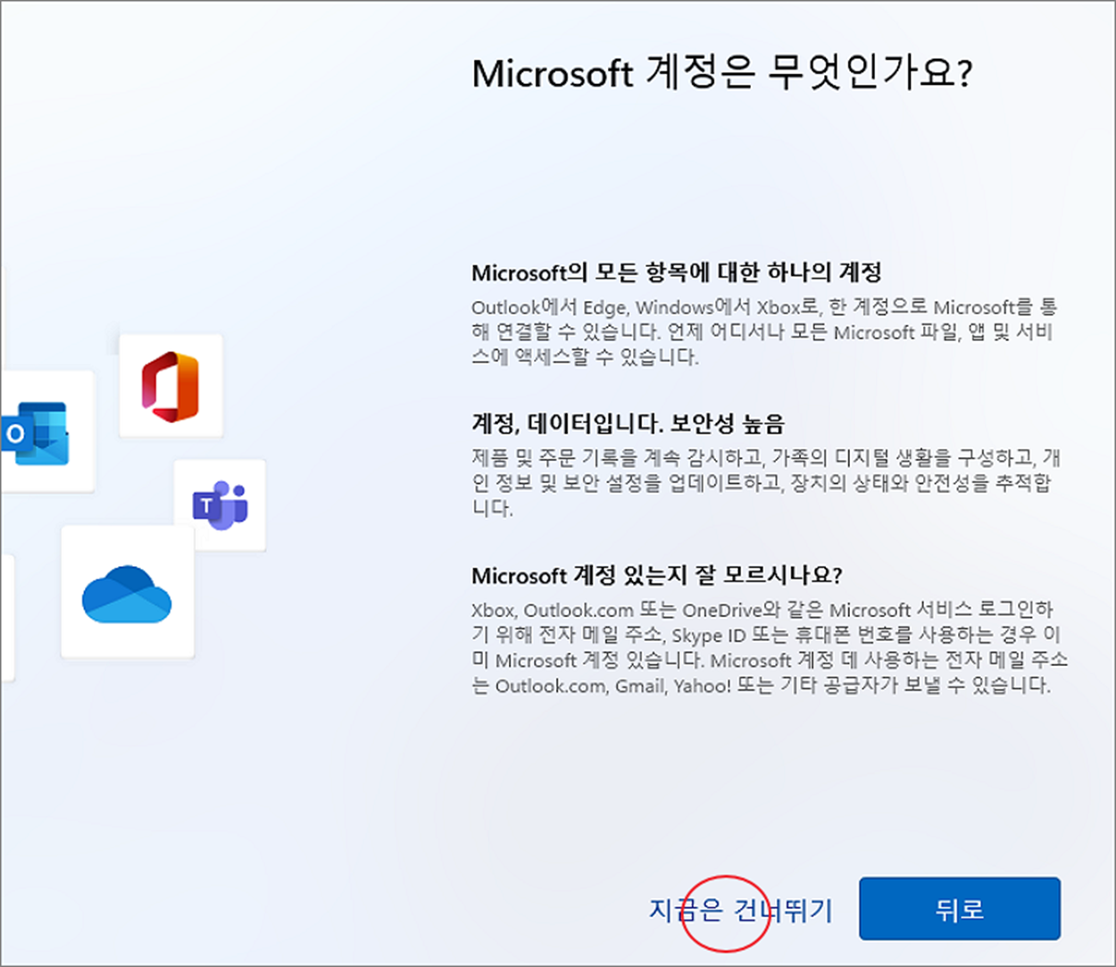 ▼ 다음 페이지에서는 마이크로소프트 계정을 만들어야 하는 이유에 대해서 기술하고 있습니다. 무시하고 화면 아래에 “지금은 건너뛰기” 링크를 클릭합니다.