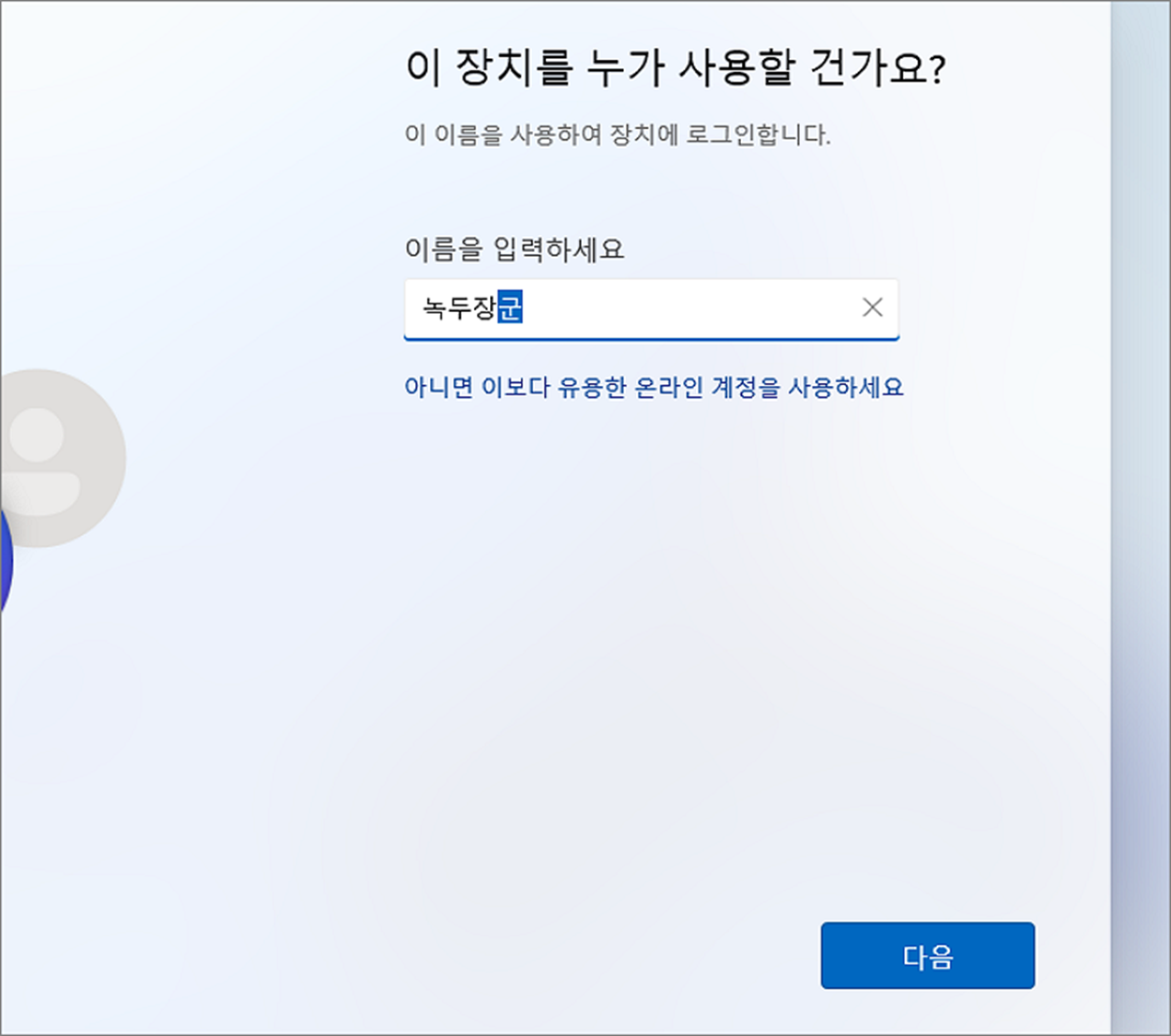 ▼ 이제 로컬 계정 명을 만들어야 합니다. 화면 입력란에 이름을 입력합니다.