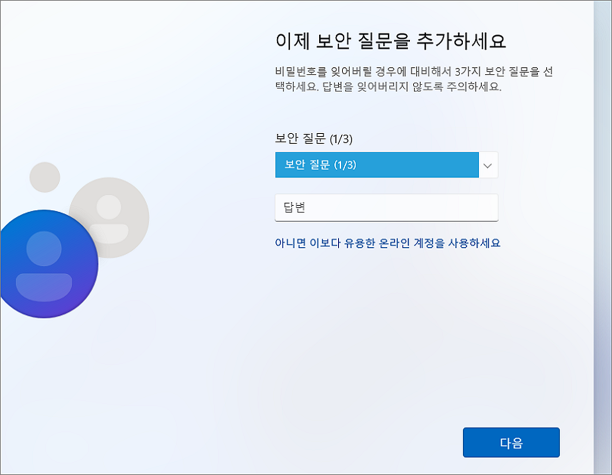 ▼ 마지막으로 로컬 계정을 만들 때 보안 질문 3가지에 대한 답변을 입력해야 합니다. 필수 입력란으로 3가지 모두 작성해야 계정을 만들 수 있습니다.