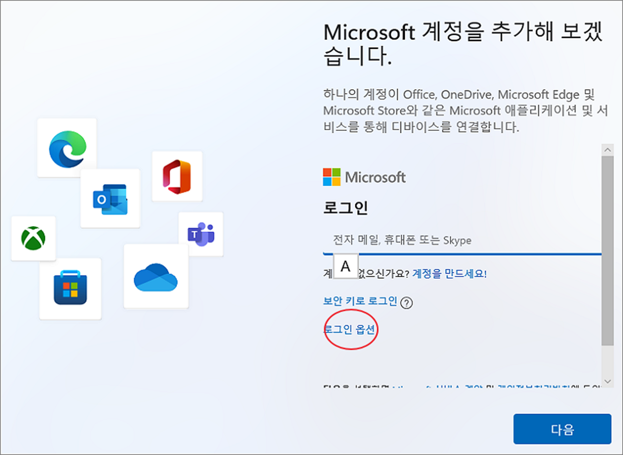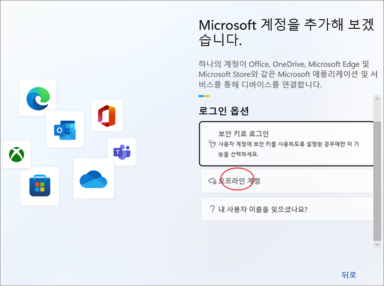 ▼ 마이크로소프트 계정 추가화면에서 로그인 옵션 중 오프라인 계정 메뉴를 클릭합니다.