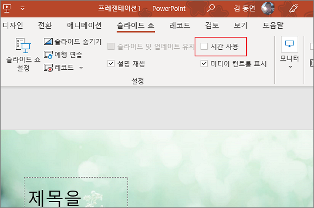 ▼ 다음은 슬라이드 쇼 > 시간 사용 옵션이 체크되어 있는지 확인합니다. 수동으로 전환하더라도 시간 사용을 체크하면 시간이 되었을 때 자동으로 넘어가게 됩니다.