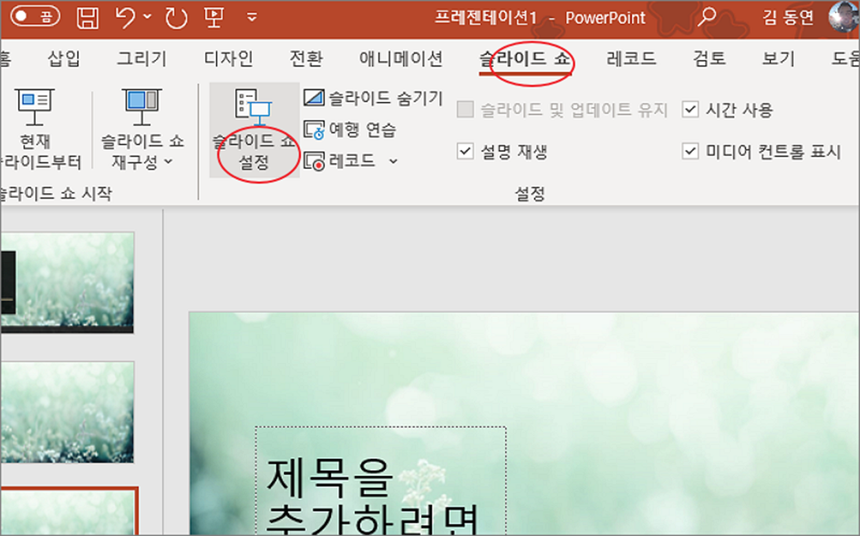 ▼ 슬라이드 쇼 설정을 변경하기 위해 슬라이드 쇼 > 슬라이드쇼 설정 리본 메뉴를 클릭합니다.
