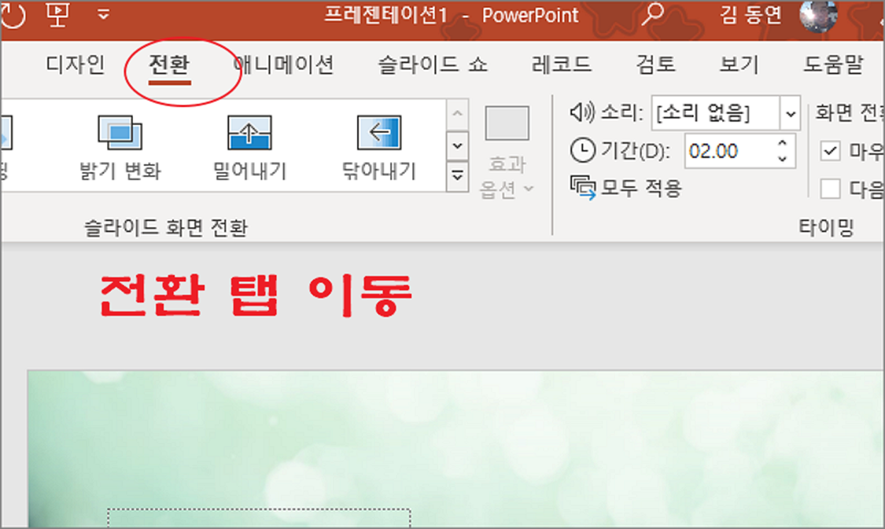 ▼ 마지막으로 하나 더 체크할 것이 있습니다. 슬라이드 전환할 때 필요한 마우스 클릭 옵션입니다. 상단 전환 탭을 클릭합니다.