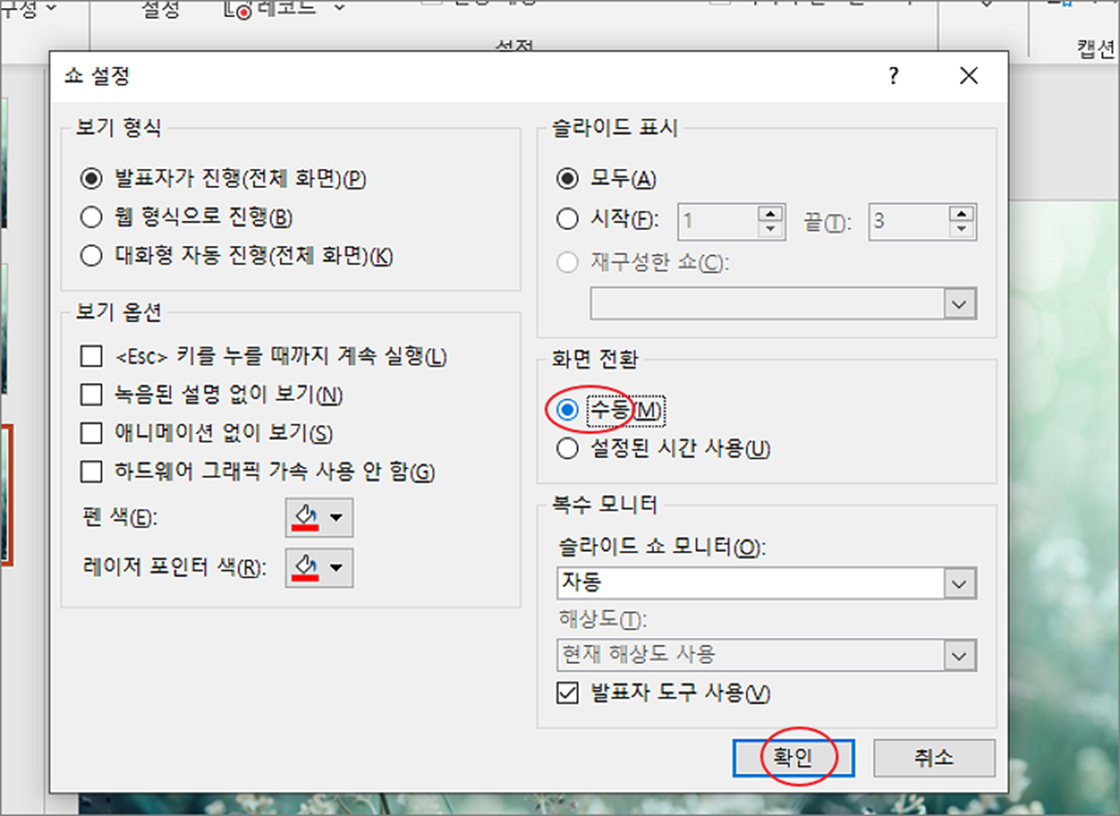 ▼ 쇼 설정 팝업창에서 화면 전환 항목을 찾습니다. 화면 전환의 기본은 설정된 시간에 전환하는 자동입니다. 이것을 수동으로 전환할 수 있습니다. 화면 전환 항목에 수동 옵션을 체크합니다.