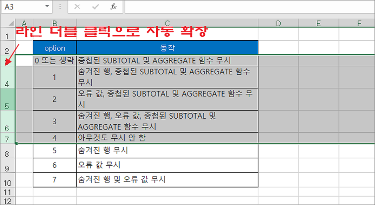 ▼ 다음은 행을 구분하는 라인 중 아무거나 더블 클릭합니다. 결과는 다음과 같습니다. 텍스트의 크기에 맞게 셀의 크기가 늘어나거나 줄었습니다.