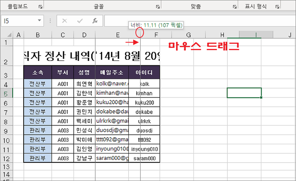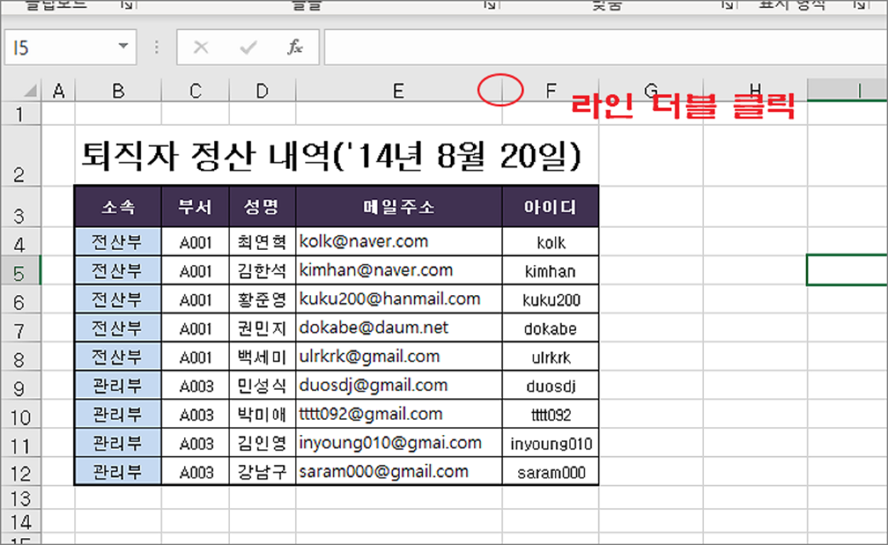 ▼ 보통 마우스를 이용해서 셀을 텍스트에 맞출 때 셀 구분 라인을 마우스로 끌어서 늘입니다. 이것은 사용자가 텍스트를 눈으로 가늠해서 맞추는 방법입니다.