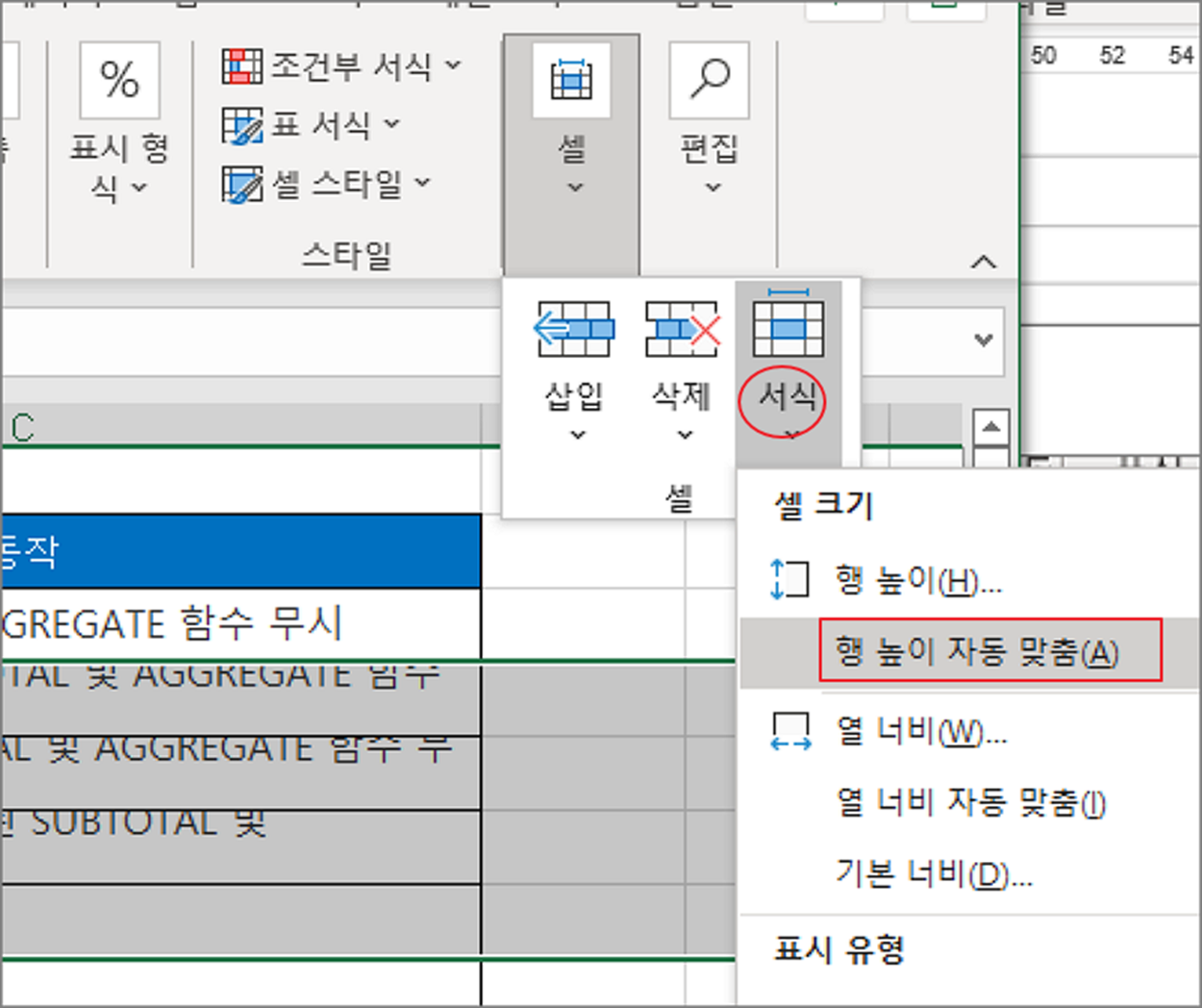 ▼ 서식 하위 메뉴에 행 높이 자동 맞춤 메뉴를 선택합니다. 그 전에 높이 조절이 필요한 셀을 선택한 상태여야 합니다. 이 방법은 위에서 설명한 열 너비에도 해당합니다.