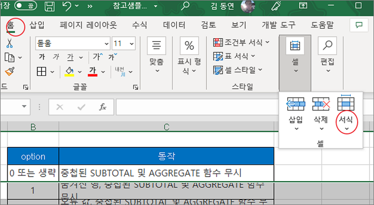 ▼ 두 번째 방법은 리본 메뉴를 이용하는 것입니다. 홈 탭 > 셀 그룹 > 서식 으로 이동합니다.