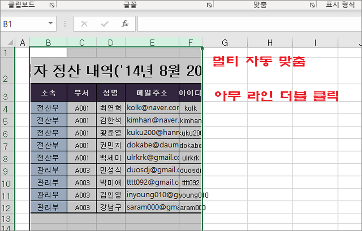 ▼ 여러 셀을 한 번에 맞추고 싶을 때도 동일한 방법을 사용합니다. 마우스로 드래그해서 열을 선택한 뒤에 아무 라인이나 더블 클릭합니다. 선택한 열 전체가 텍스트의 길이에 맞춰서 늘어나거나 줄어듭니다.