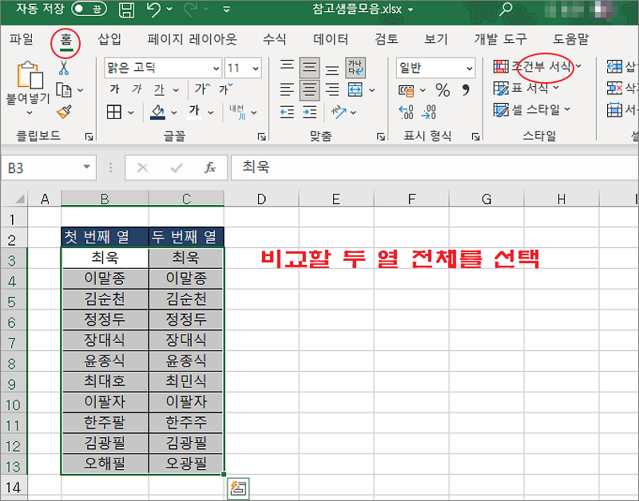 ▼ 두 열을 비교해서 차이나는 셀을 찾고자 할 때 조건부 서식을 이용해 보세요. 많은 셀을 비교할 경우 아주 편리합니다. 먼저 비교할 두 열의 영역을 모두 선택합니다. 그리고 홈 탭 > 조건부 서식 리본 메뉴를 클릭합니다.