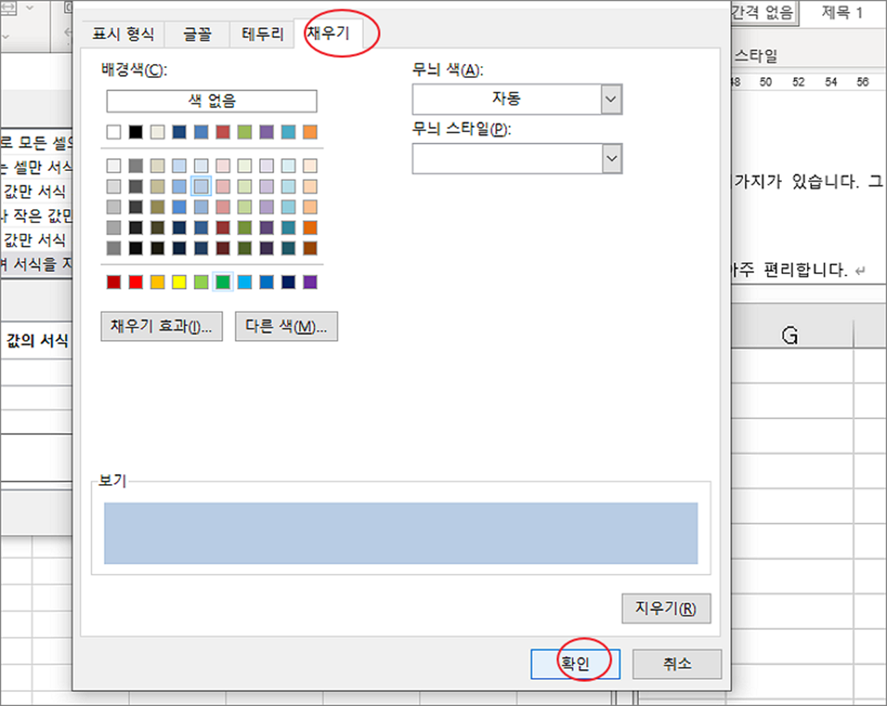 ▼ 서식 설정창에서는 결과값이 참일 때 구분할 서식을 지정합니다. 저는 배경색을 변경하기 위해 채우기에서 원하는 색을 선택했습니다.