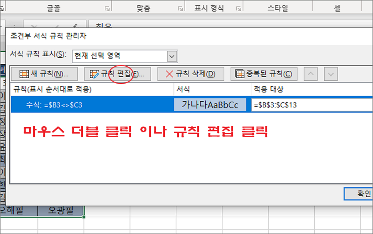 ▼ 다음은 두 열을 비교해서 같은 데이터를 찾기 위해 수식을 수정해 보겠습니다. 기존 조건부 서식을 변경하기 위해 조건부 서식 > 규칙 관리 리본 메뉴를 클릭합니다.