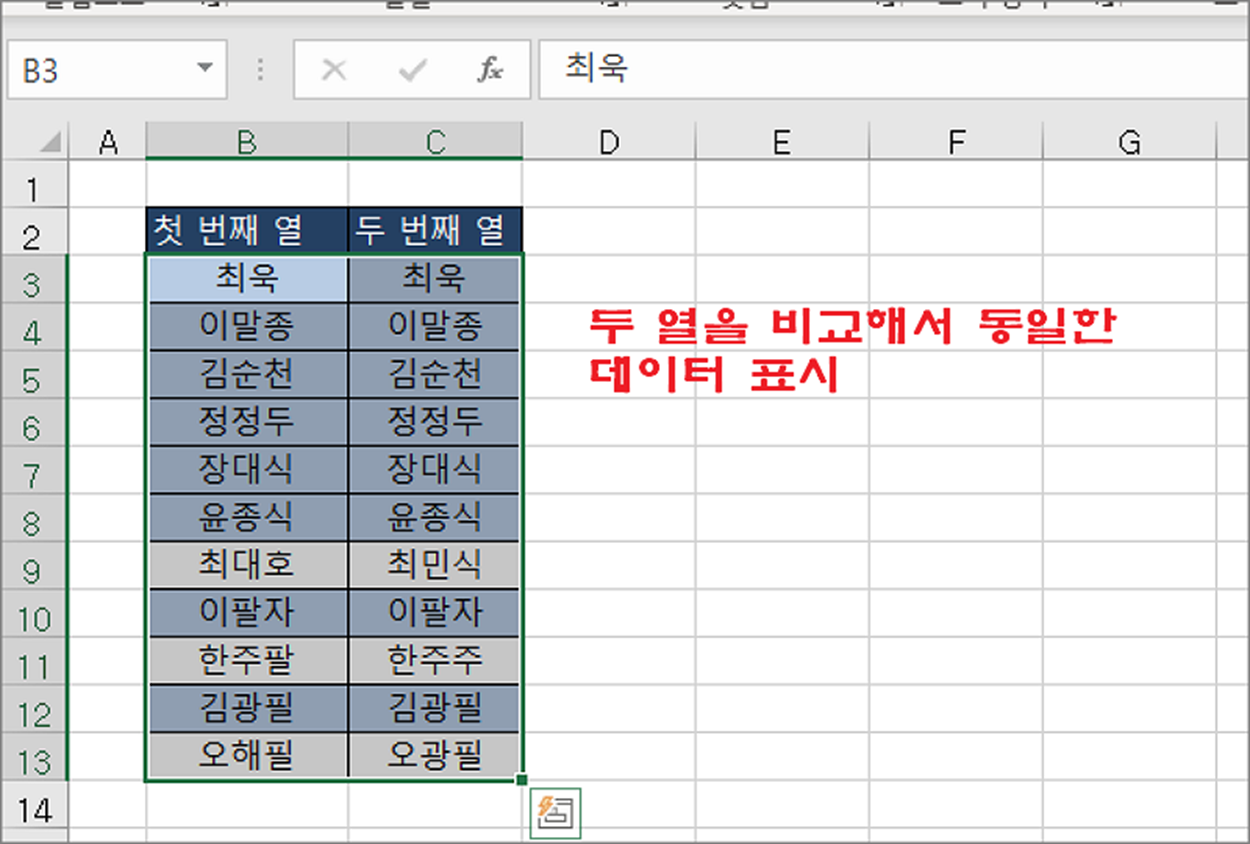 | ◎ 두 열에서 동일한 데이터 찾기 |