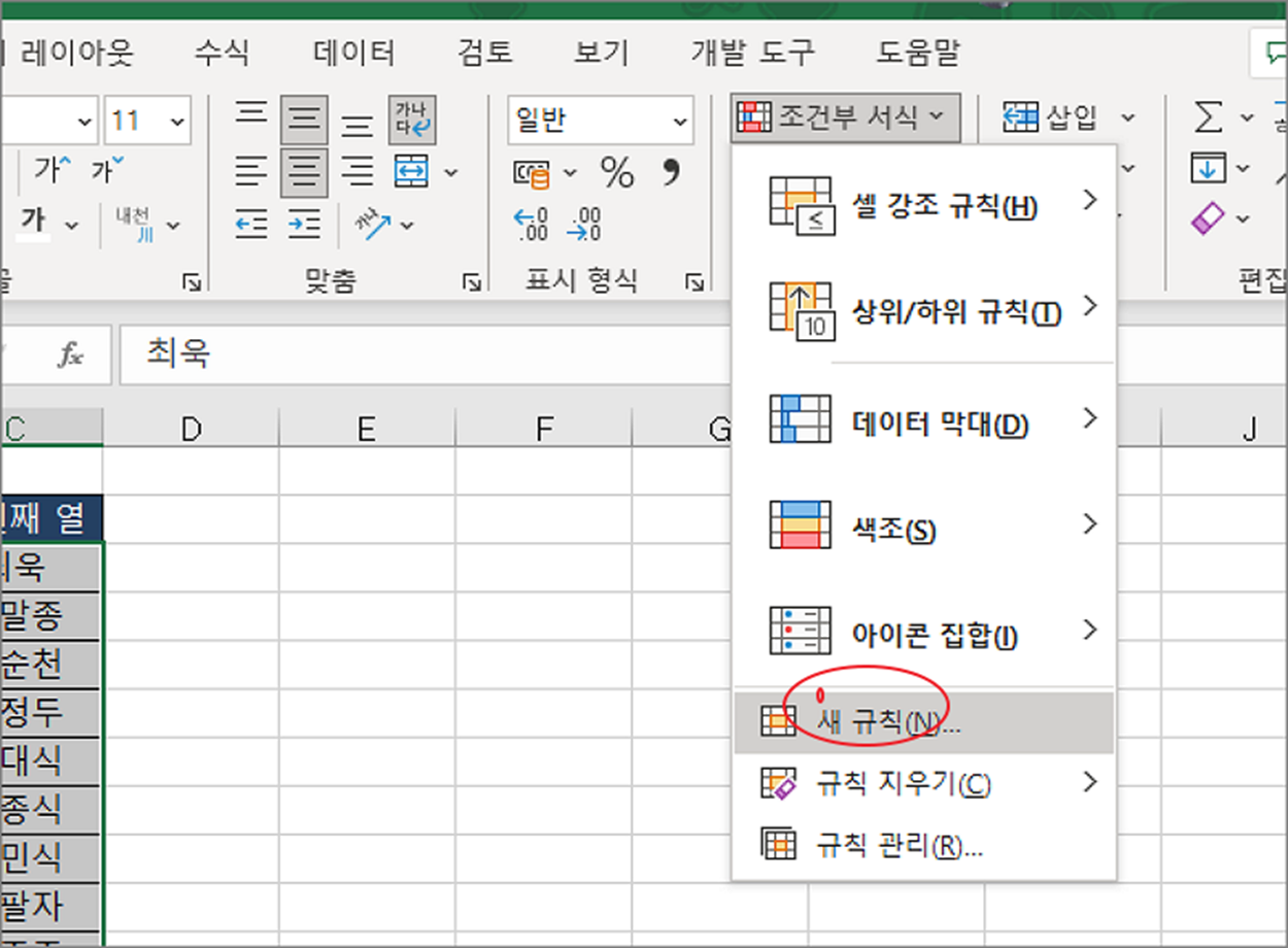 ▼ 다음 조건부 서식 하위 메뉴 목록에서 새 규칙을 선택합니다.