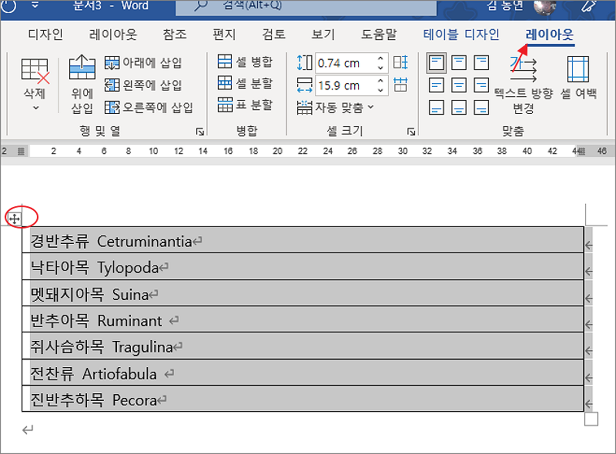 ▼ 다음은 표에서의 데이터 정렬 방법입니다. 정렬할 표를 선택하면 나타나는 상단 탭에서 레이아웃으로 이동합니다.