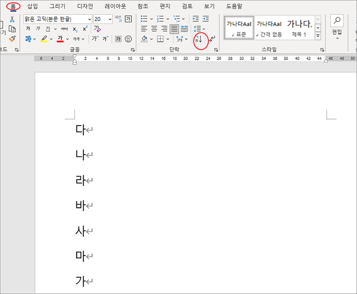 ▼ 먼저 워드 페이지에 글을 정렬하는 방법을 알아봅니다. 글 정렬의 기본 기준은 단락입니다. Enter 로 구분되는 단락의 첫 글자를 알파벳과 가나다 순으로 오름차순/내림차순 정렬을 할 수 있습니다. 정렬 리본 메뉴는 홈 탭 > 단락 > 정렬 입니다.