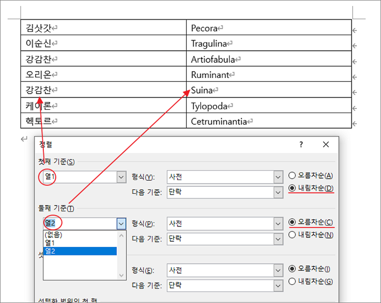 ▼ 정렬 창에는 선택한 열의 개수에 맞게 기준 항목이 활성화됩니다. 첫 번째 열은 내림차순으로 하고 두 번째 열을 오름차순으로 합니다.