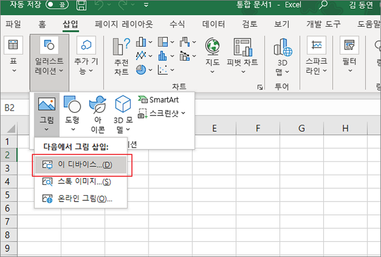 ▼ 이미지를 추가하는 첫 번째 방법입니다. 자신의 컴퓨터에 있는 로컬 이미지를 올려 보겠습니다. 삽입 탭 > 일러스트레이션 > 그림 > 이 디바이스 리본 메뉴를 선택합니다.
