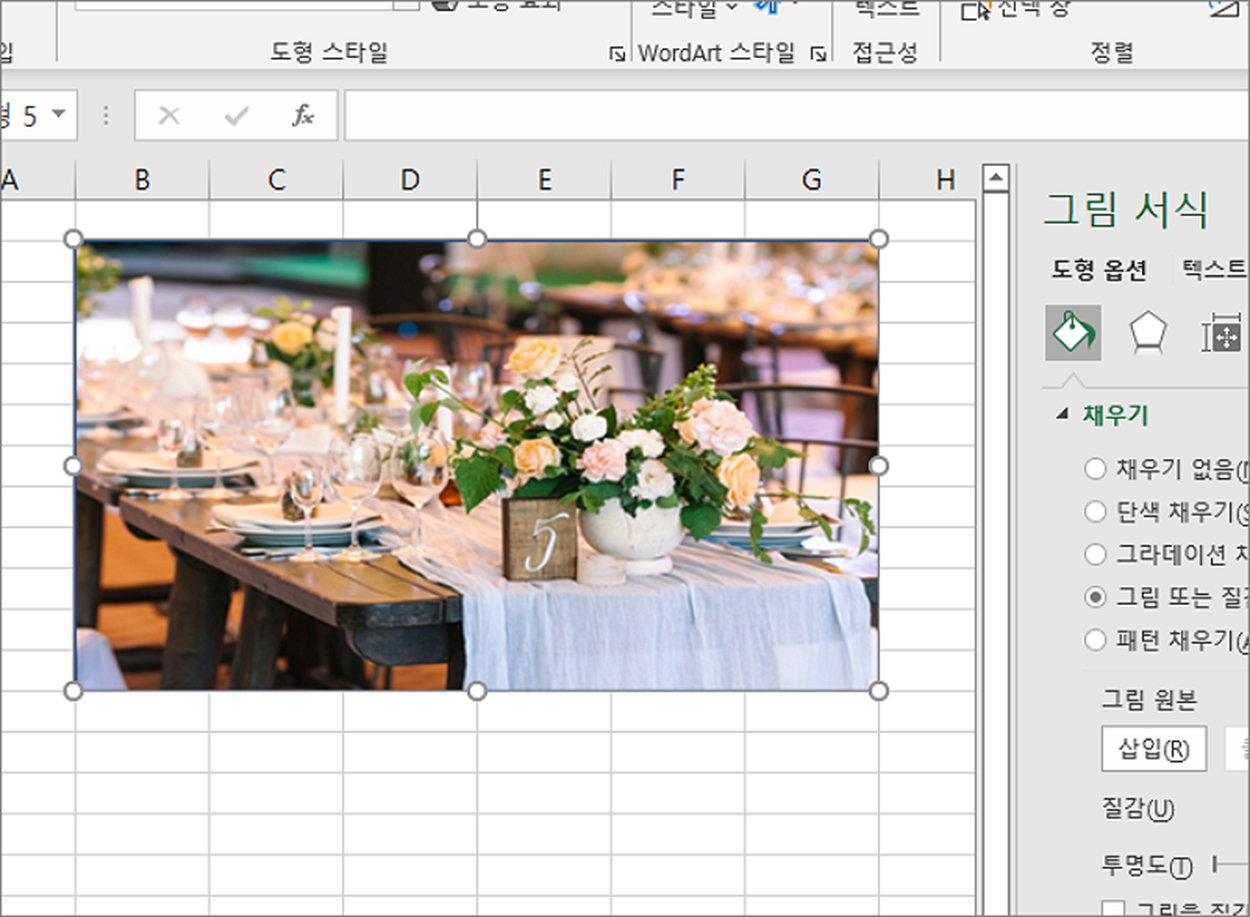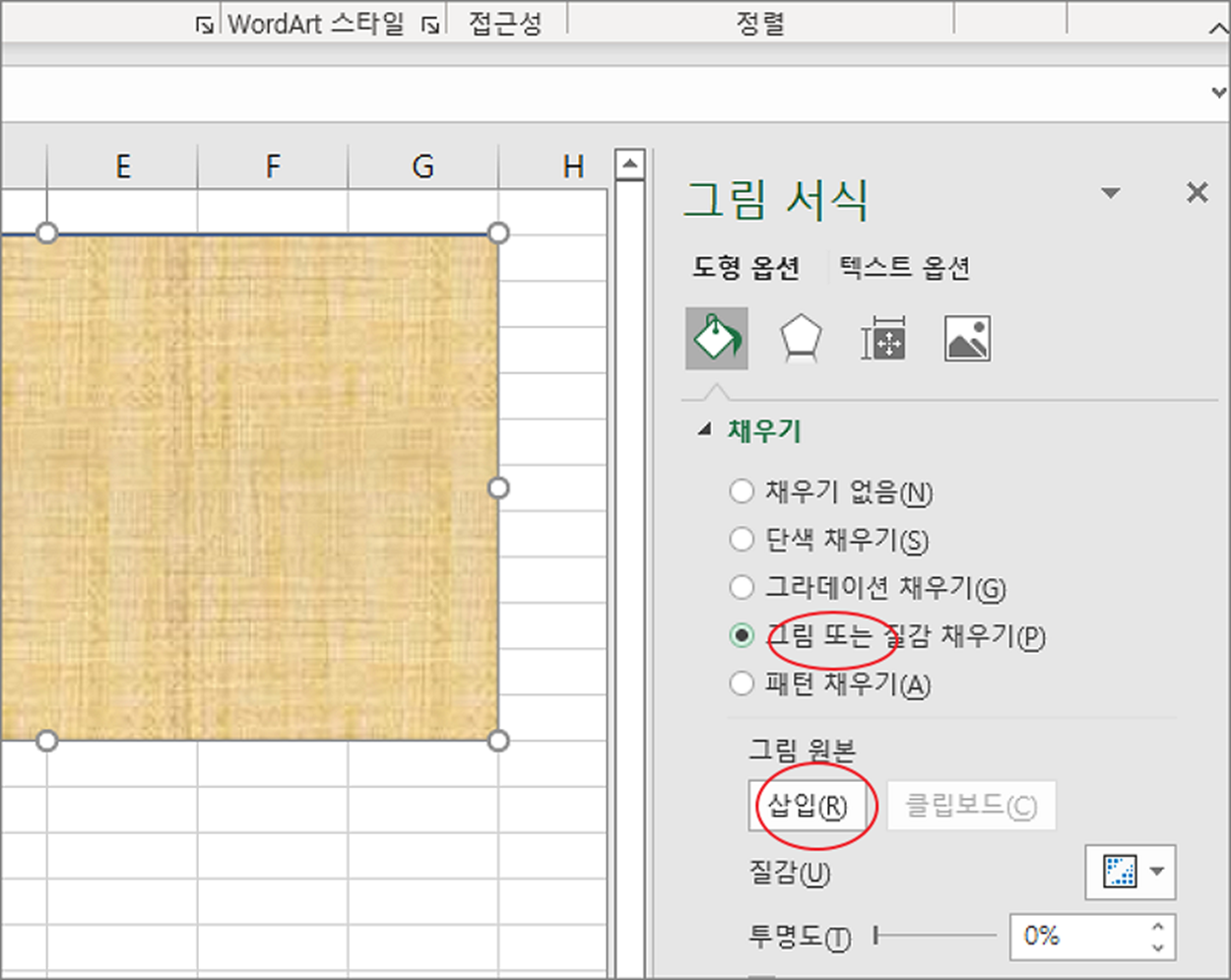 ▼ 오른쪽에 나타난 그림 서식 설정창에서 채우기 > 그림 또는 질감 채우기를 선택합니다. 다음 아래로 내려가서 이미지를 추가하기 위해 삽입 버튼을 클릭합니다.