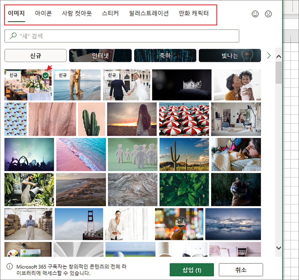 ▼ 스톡 이미지 삽입 창이 뜨면 상단 이미지 탭을 선택하고 목록에서 삽입하고 싶은 이미지를 골라 체크합니다. 팝업창 아래로 내려가서 삽입 버튼을 클릭합니다.