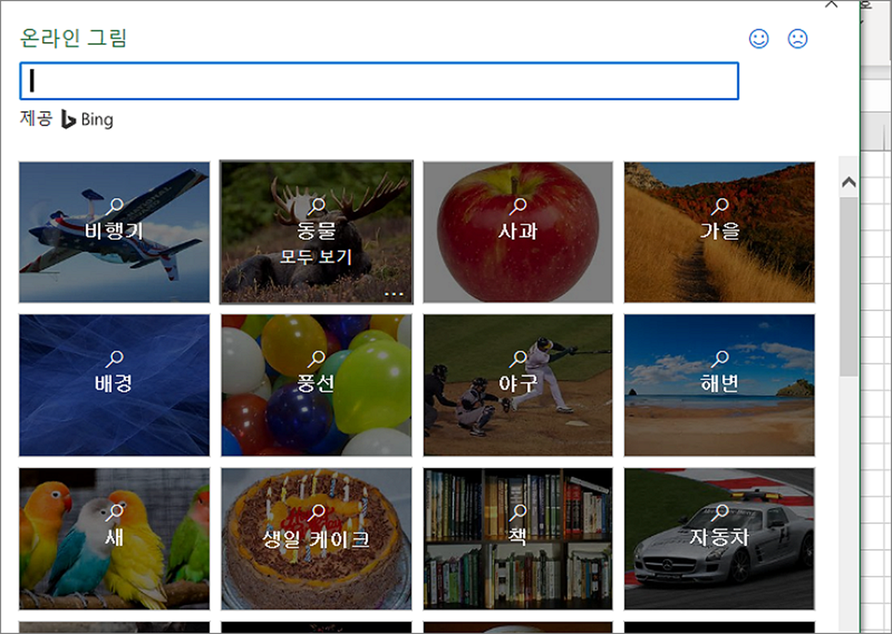 ▼ 온라인 그림 창이 뜨면 아래 이미지 분류에서 찾거나 검색을 이용합니다. 검색엔진은 마이크로소프트에서 제공하는 Bing 입니다.