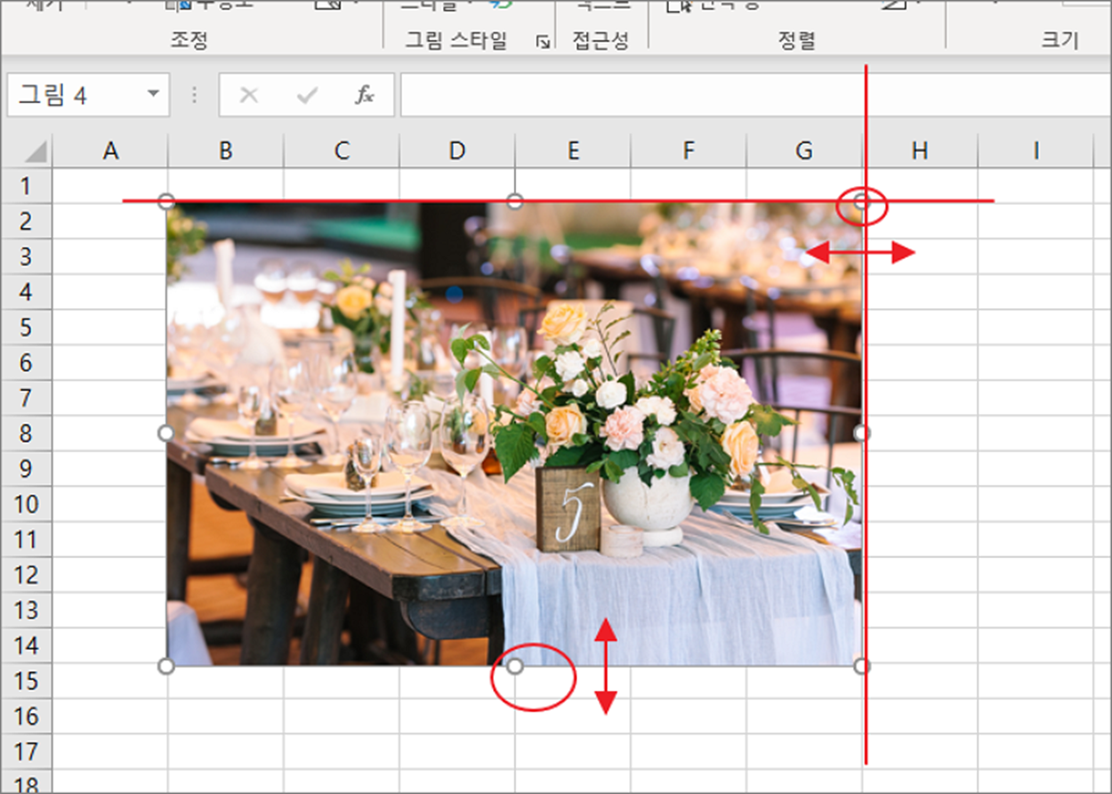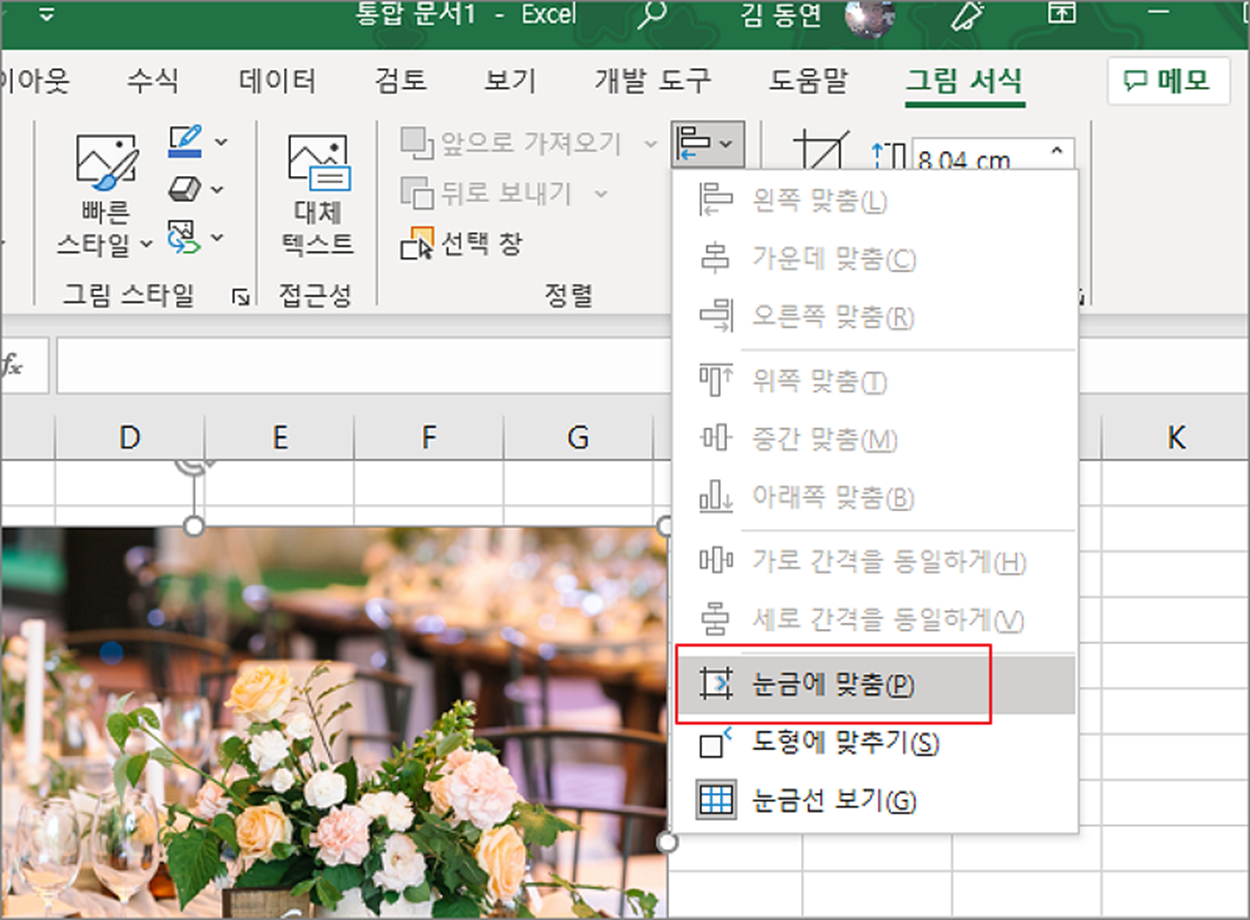 ▼ 삽입한 이미지를 시트 라인에 맞추는 방법을 알아봅시다. 문서 작성 중에 이미지를 셀에 맞추는 경우가 있기 때문에 알아 두시기 바랍니다. 이미지를 선택하고 상단 그림 서식 탭으로 이동합니다. 그리고 정렬 > 이미지 정렬 리본 메뉴를 클릭합니다.