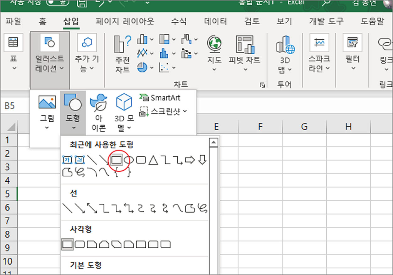 ▼ 다음은 이미지를 도형에 맞춰서 추가하는 방법입니다. 자신이 원하는 도형 형태에 이미지를 맞출 수 있기 때문에 많이 이용합니다. 먼저 도형을 추가해 보겠습니다. 삽입 탭 > 일러스트레이션 > 도형 에서 사각형을 추가합니다.