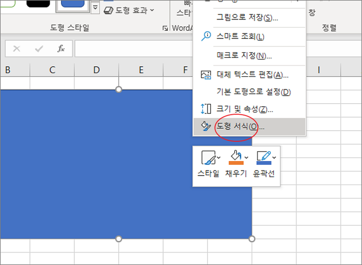 ▼ 추가한 도형을 선택하고 오른쪽 마우스를 클릭합니다. 메뉴 목록에서 제일 아래에 있는 도형 서식을 선택합니다.
