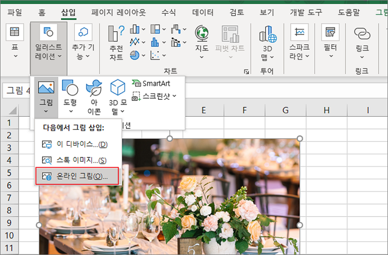 엑셀에서 이미지를 시트에 추가하는 방법에는 여러가지가 있습니다. 자신의 컴퓨터에 저장된 이미지를 추가하거나 오피스에서 제공하는 저장된 라이브러리 이미지를 불러와서 사용할 수 있습니다. 그리고 Bing 검색엔진을 통해 온라인에 올라가 있는 이미지를 검색해서 추가할 수도 있습니다.