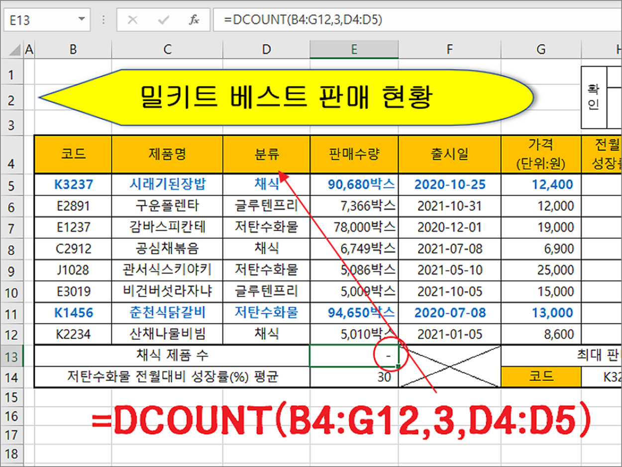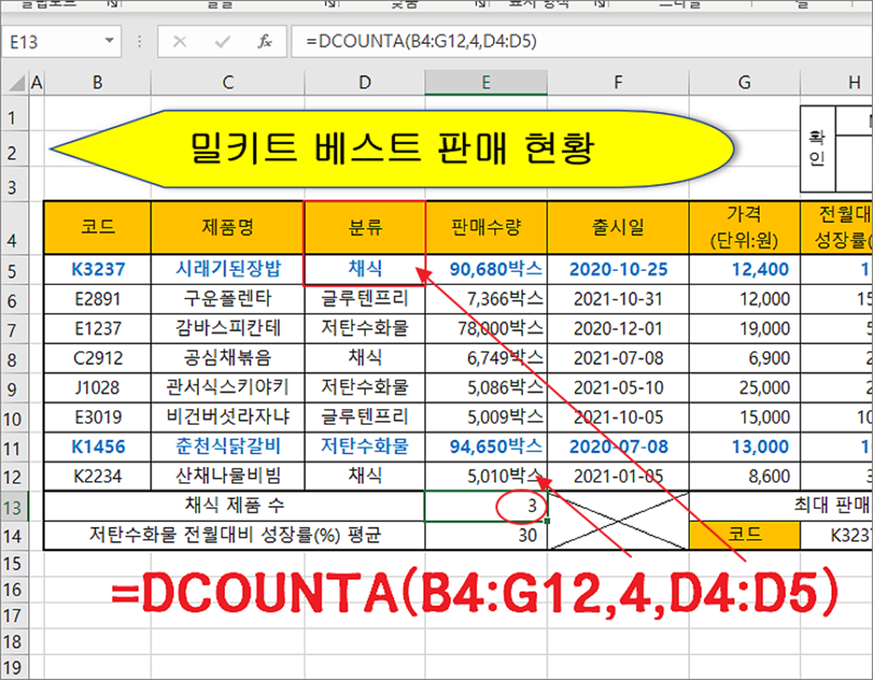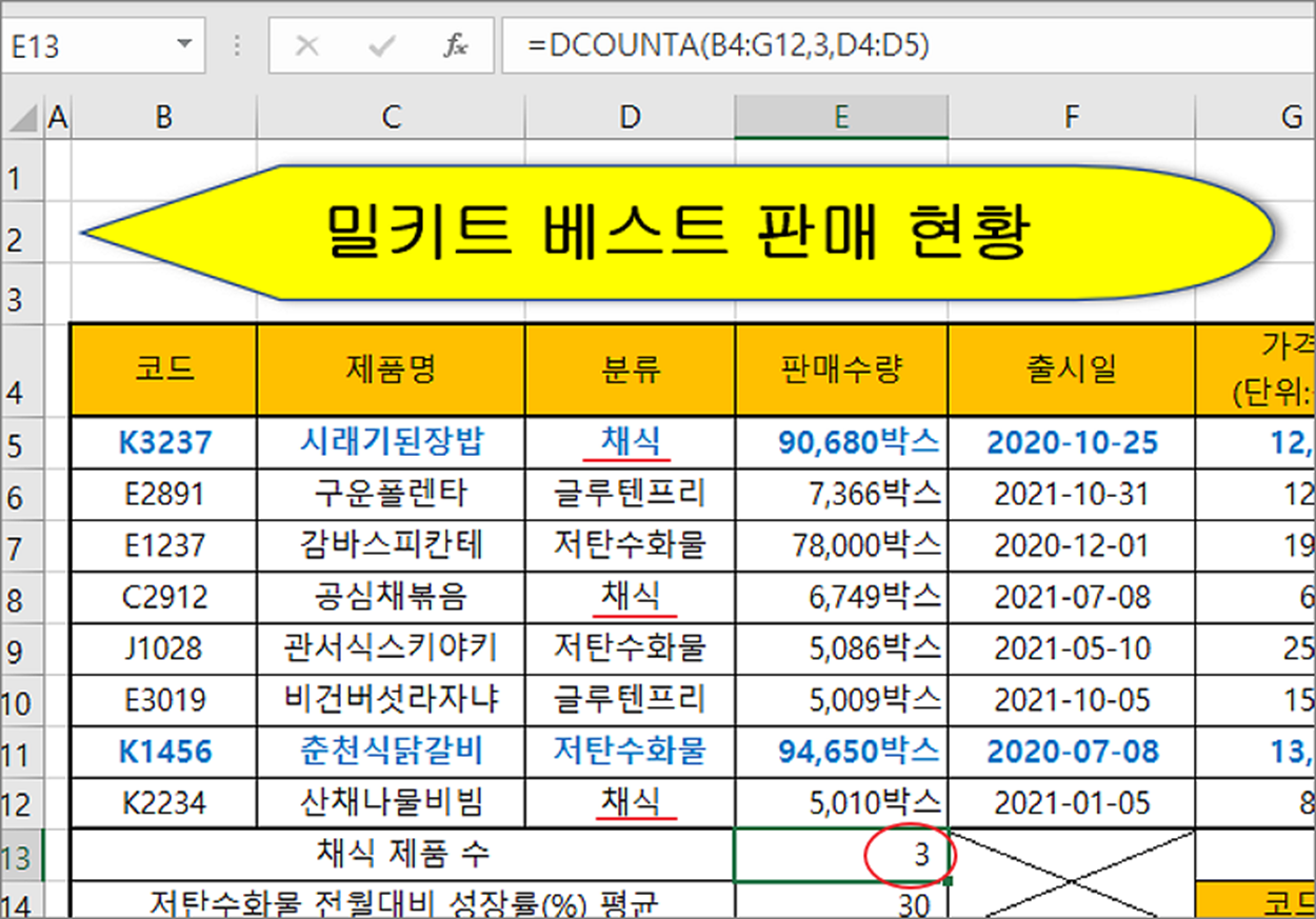 ▼ 샘플에서는 3번째 분류 열인 “채식” 제품의 수가 몇 개인지 계산할 것입니다.