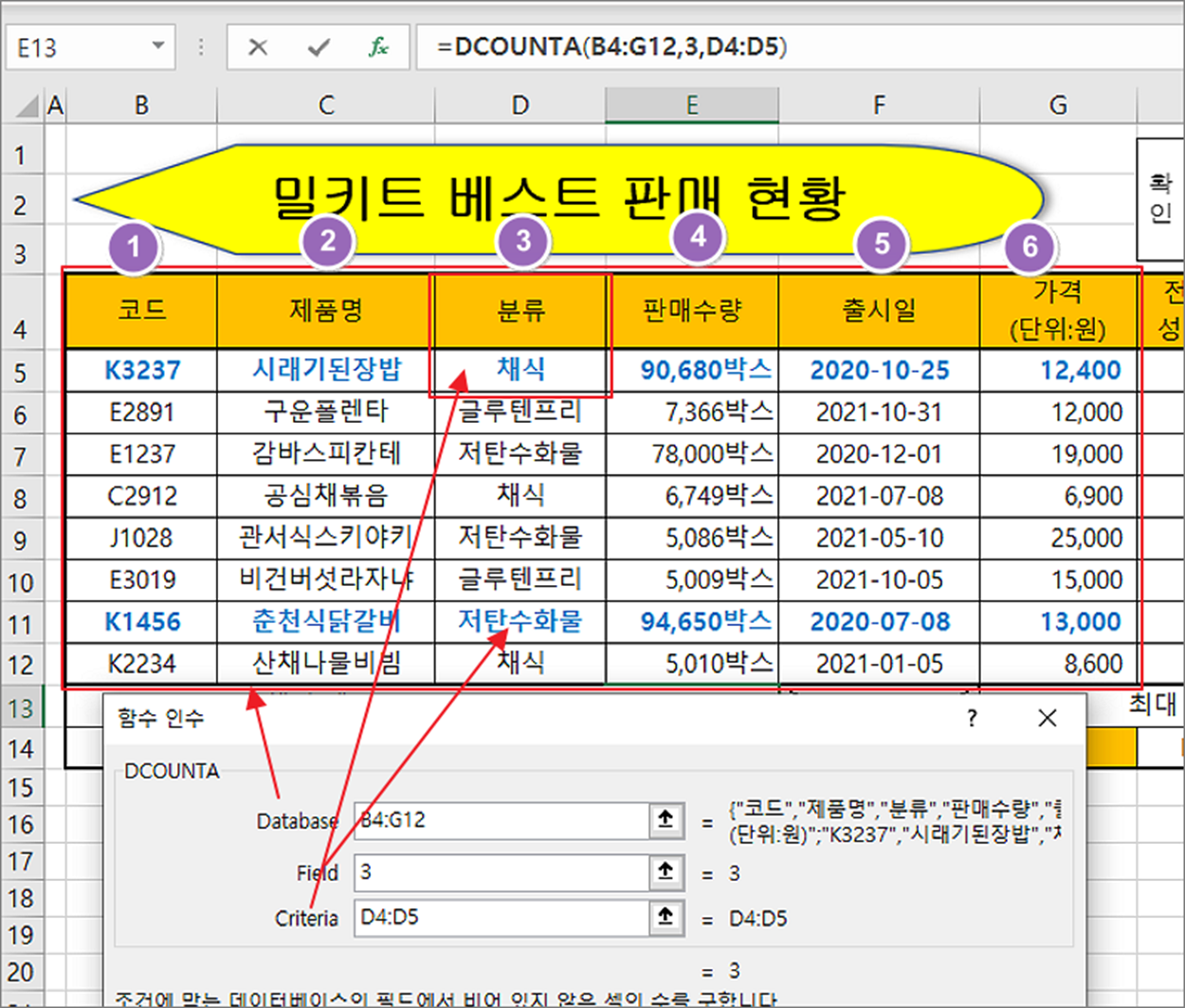 ▼ DCOUNTA 함수는 목록이나 데이터베이스 영역에서 지정한 조건에 맞는 텍스트나 숫자의 개수를 구합니다. D 는 Database 의 약자입니다. 함수의 구성은 DCOUNT (database, field, criteria) 로 되어 있습니다. 인수에 대한 설명은 다음과 같습니다.