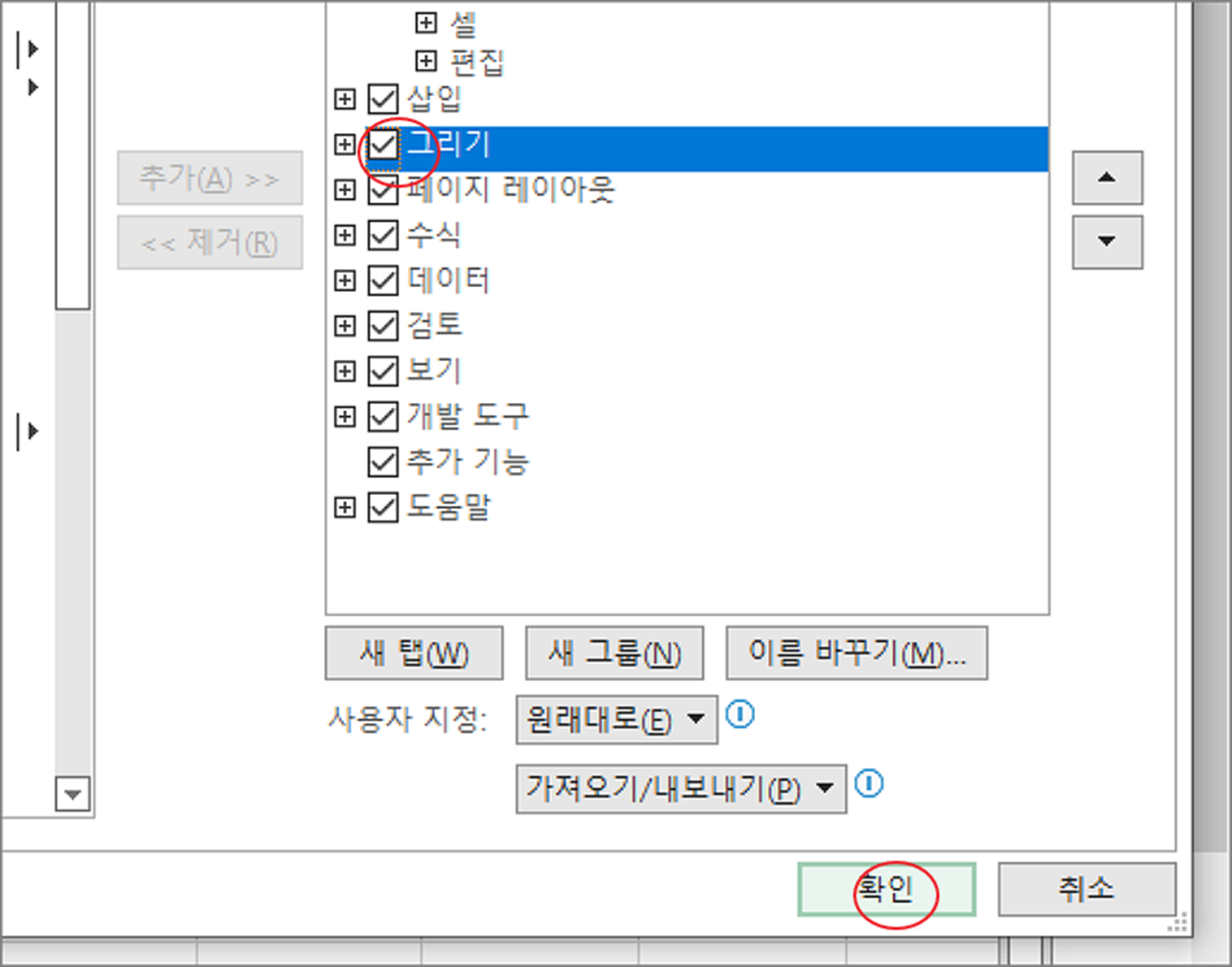 ▼ 다음은 그리기 항목을 찾아 체크하고 화면 하단에 확인 버튼을 눌러 창을 닫습니다.