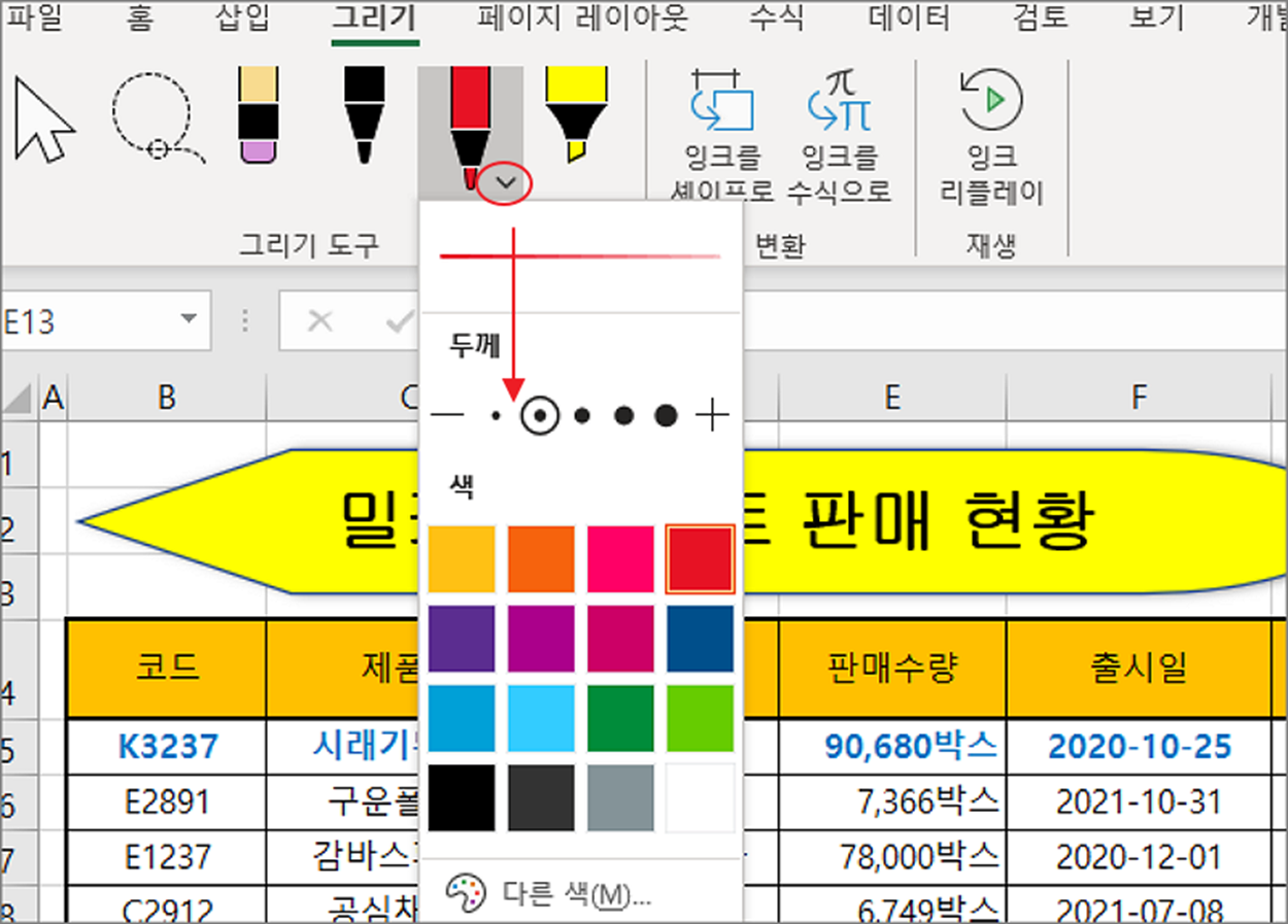 ▼ 이제 엑셀 화면으로 가서 그리기 탭이 추가되어 있는지 확인합니다. 다음 그리기 탭 안에서 사용하고 싶은 펜을 선택합니다. 선택한 펜 이미지 바로 옆에 화살표를 눌러 보세요. 펜의 속성을 지정하는 화면이 나타나면 두께와 색을 지정합니다.