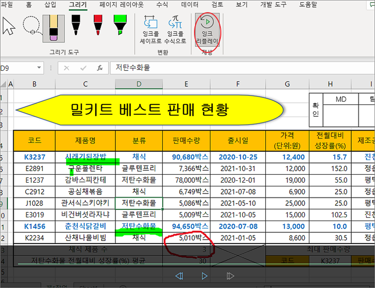 ▼ 지금까지 시트에 형광펜이나 펜으로 그린 이미지는 지우개 도구로 삭제할 수 있습니다. 지우개 리본 메뉴를 선택한 다음 펜으로 그린 영역을 클릭합니다.