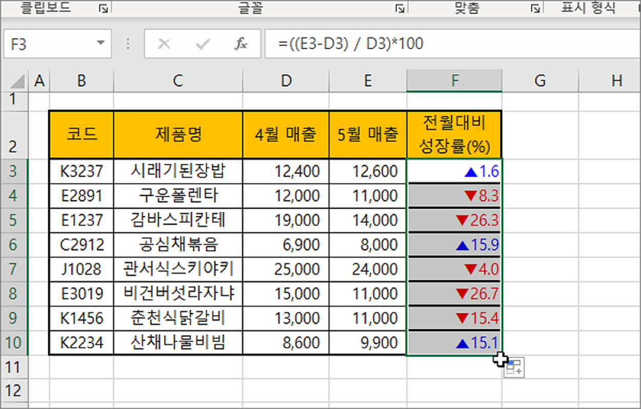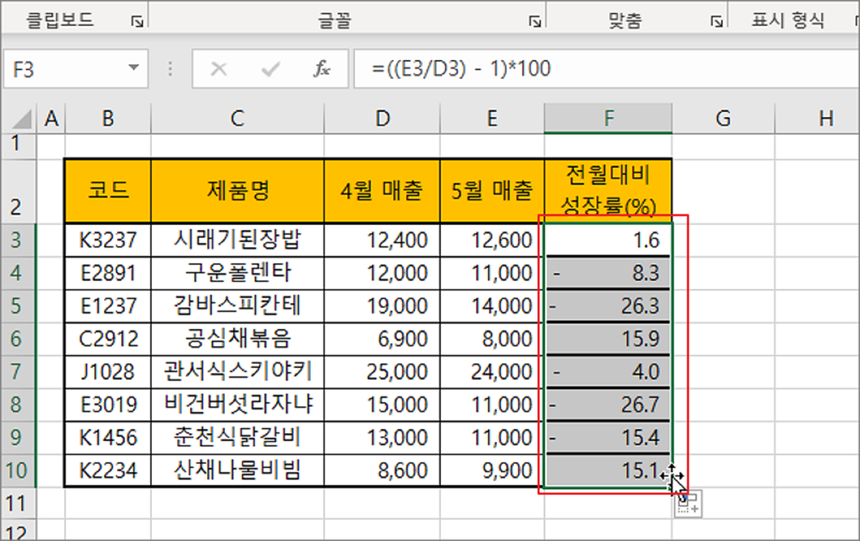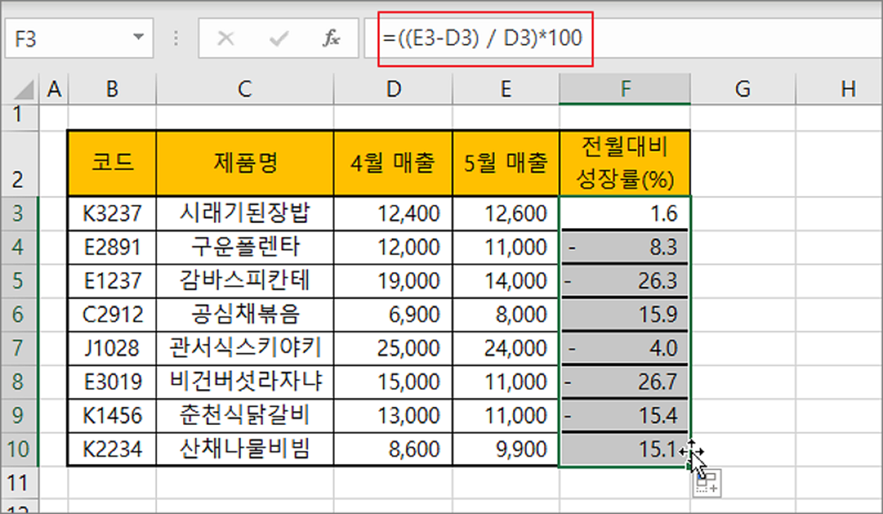 ▼ 결과는 다음과 같습니다. 전체 수식을 모든 행에 적용해 보면 증감률을 확인할 수 있습니다.