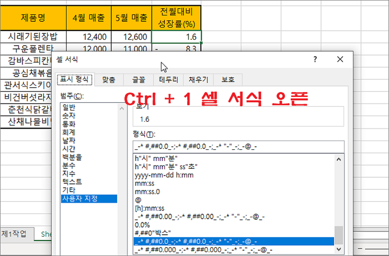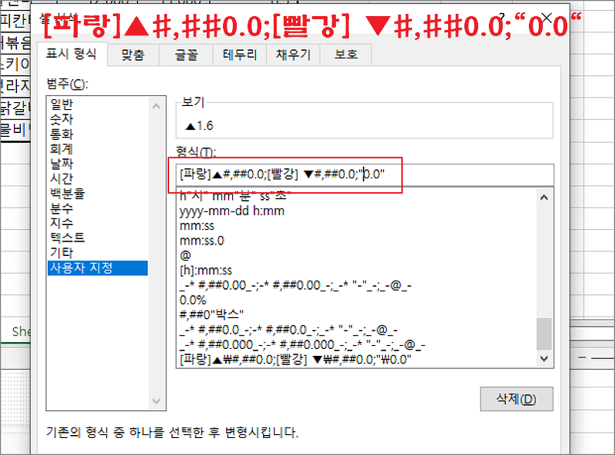 ▼ 범주를 사용자 지정 으로 선택하고 형식 란에 값을 아래와 같이 입력합니다. 해석하자면 “;” 세미콜론으로 3가지 경우의 수를 구분합니다. 세미콘론의 첫 번째 영역은 셀에서 계산된 값이 참일 때, 그러니까 양수일 때 적용되는 형식입니다. "[파랑]▲#,##0.0" 에서 [파랑]은 숫자 텍스트의 색상을 파란색으로 표시하라는 의미입니다. 다음 ▲ 기호가 표시됩니다. 두 번째 영역은 음수인 거짓일 때 적용됩니다. 마찬가지로 색상은 [빨강] 을 적용하고 기호로 ▼ 를 표시합니다.
