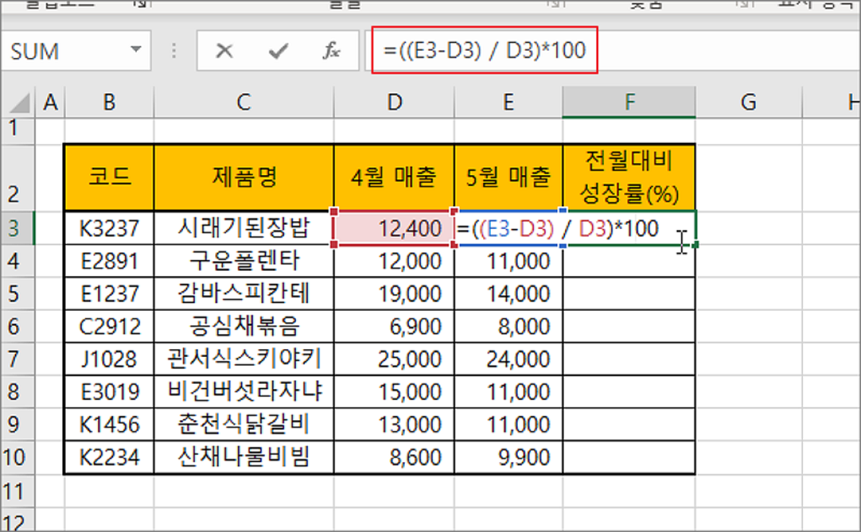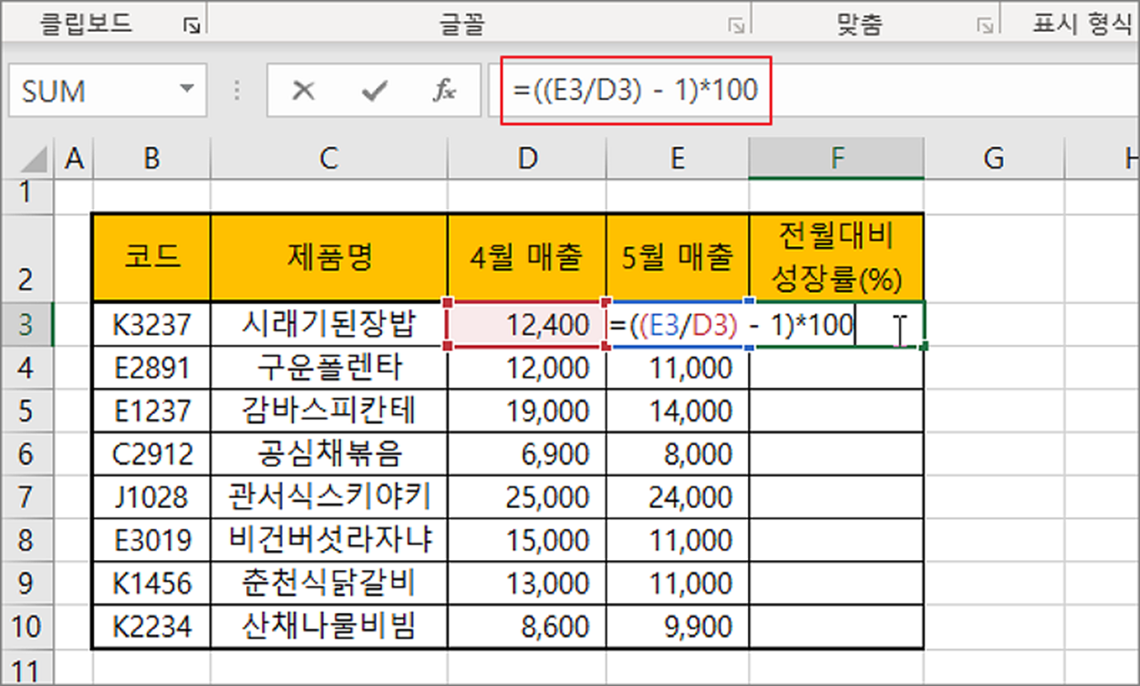 샘플에서는 4월과 5월 매출 차이를 계산해서 증감률을 % 로 계산해 보겠습니다. 첫 번째 서식을 이용해서 계산합니다.