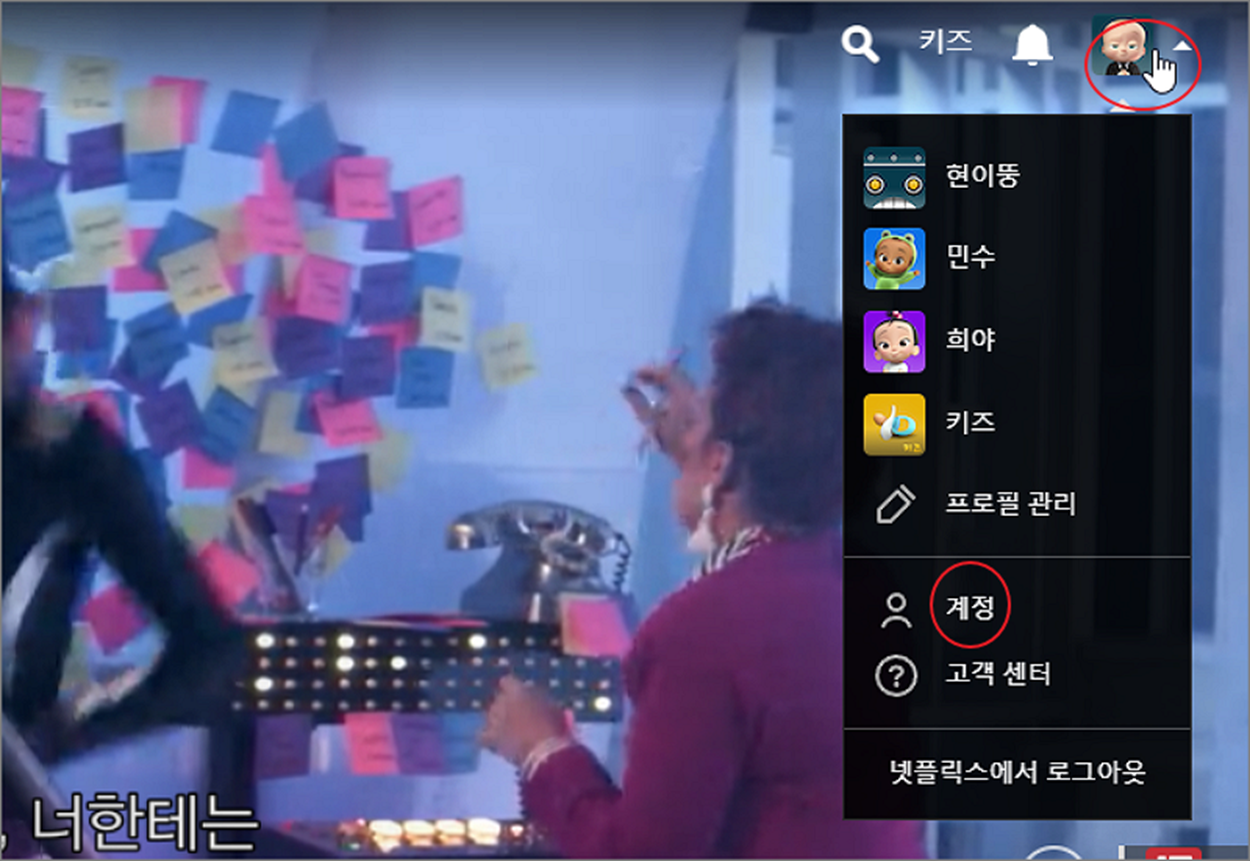 ▼ 넷플릭스 사이트에 접속합니다. 로그인하고 오른쪽 상단 계정 아이콘을 클릭합니다. 그리고 메뉴 목록에서 계정을 선택합니다.