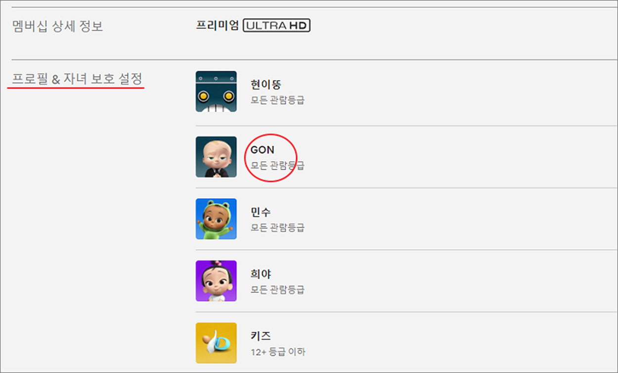 ▼ 다음 자신이 만든 프로필을 프로필 & 자녀 보호 설정 에서 찾아 선택합니다.