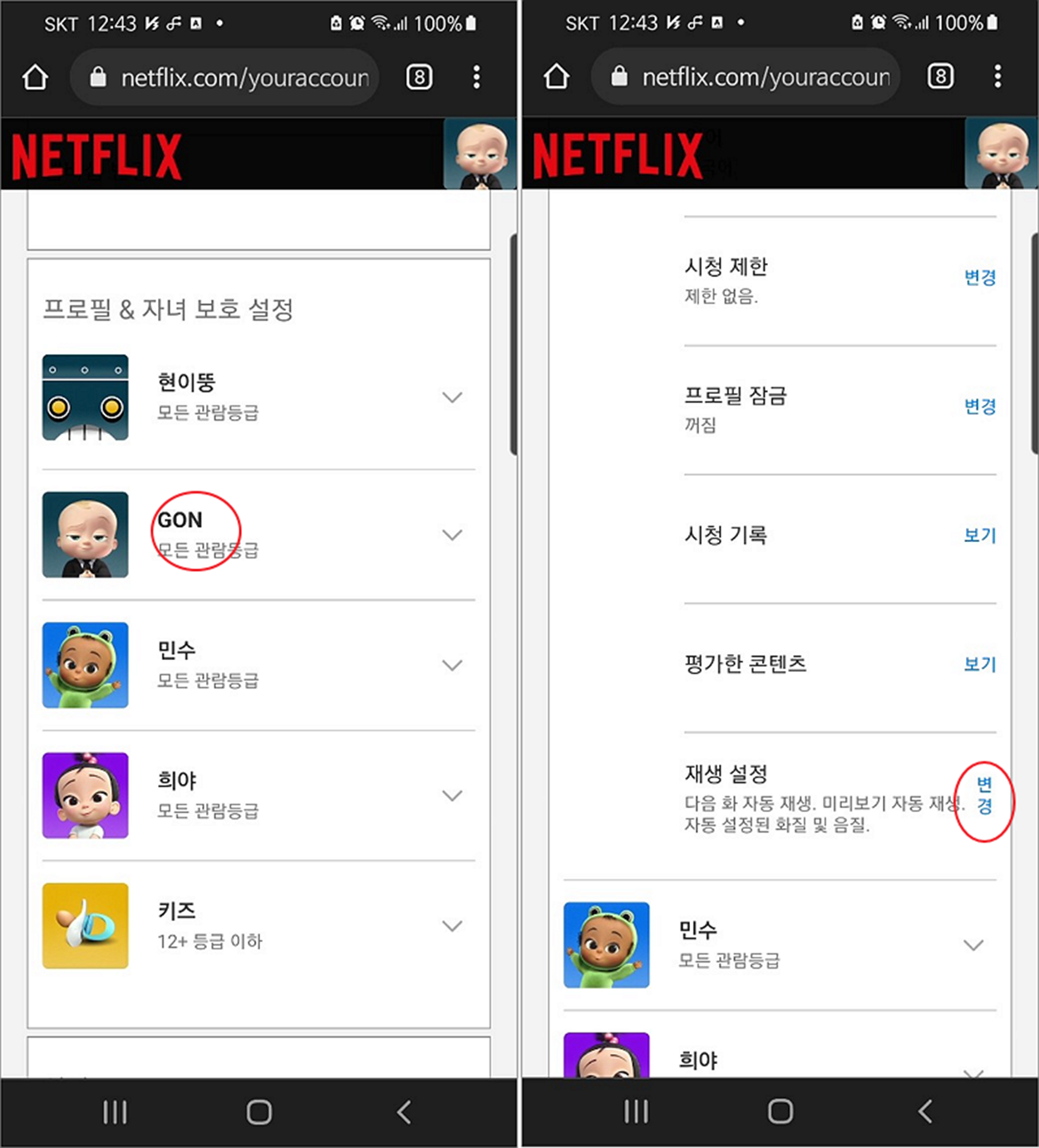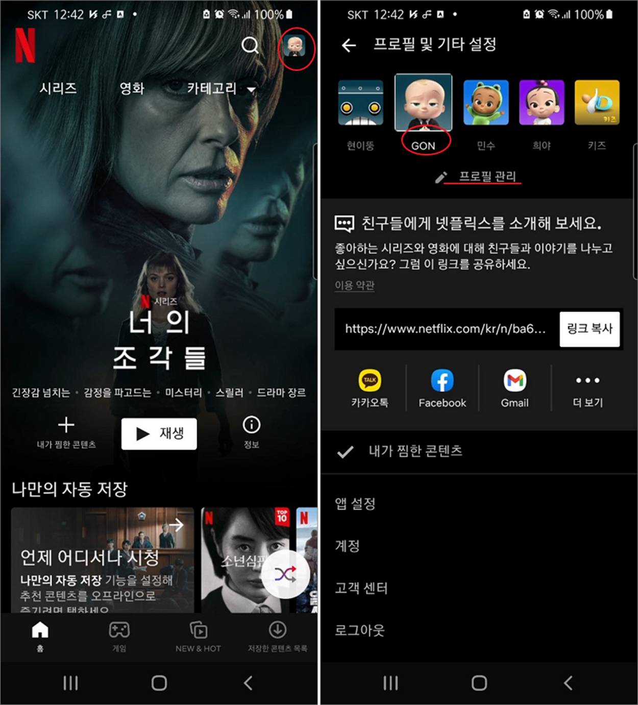 ▼ 다음은 스마트폰에서 자동 재생 설정을 변경해 보겠습니다. 넷플릭스 앱을 실행하고 로그인한 뒤 오른쪽 상단에 계정 아이콘을 클릭합니다. 다음 페이지 “프로필 및 기타 설정” 에서 자기가 만든 프로필을 선택합니다.