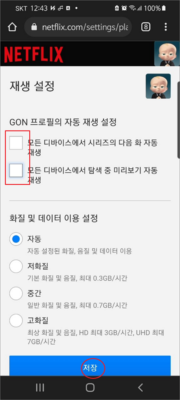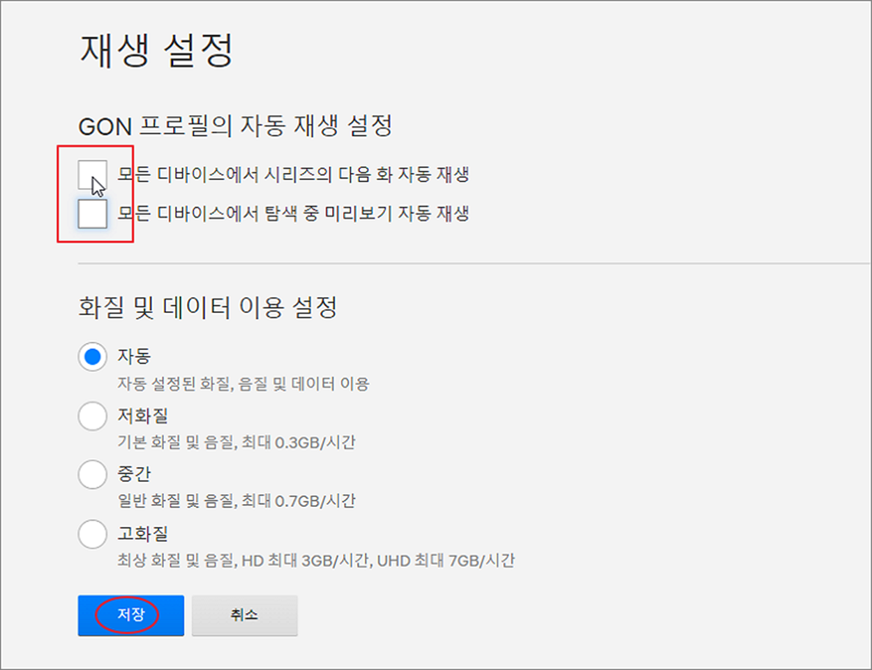 ▼ 재생 설정 화면에서 제일 상단에 자동 재생 옵션 두 개를 모두 체크해제 합니다. 다음 아래로 내려가서 저장 버튼을 클릭합니다.