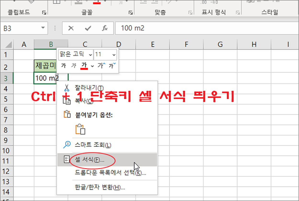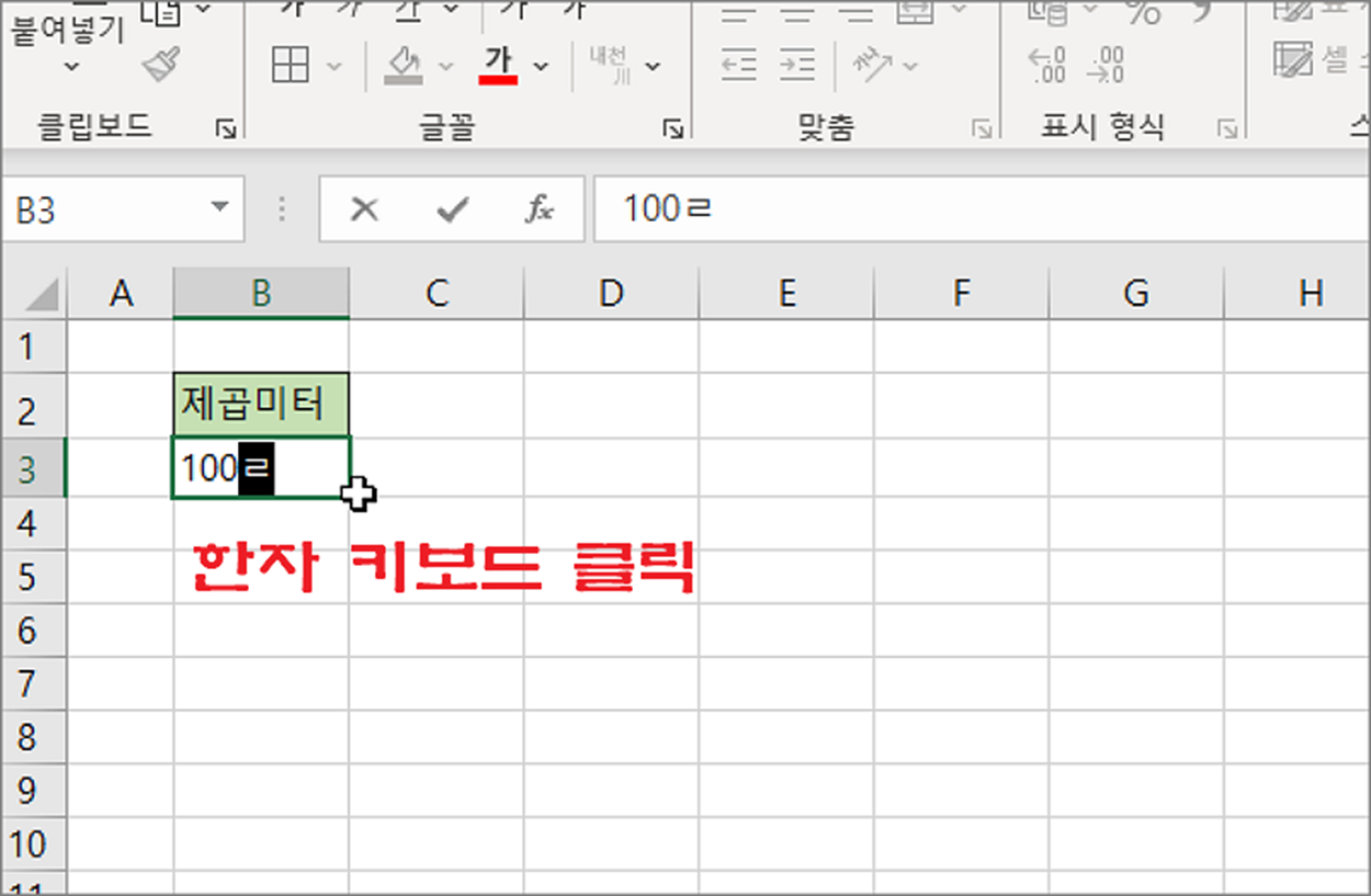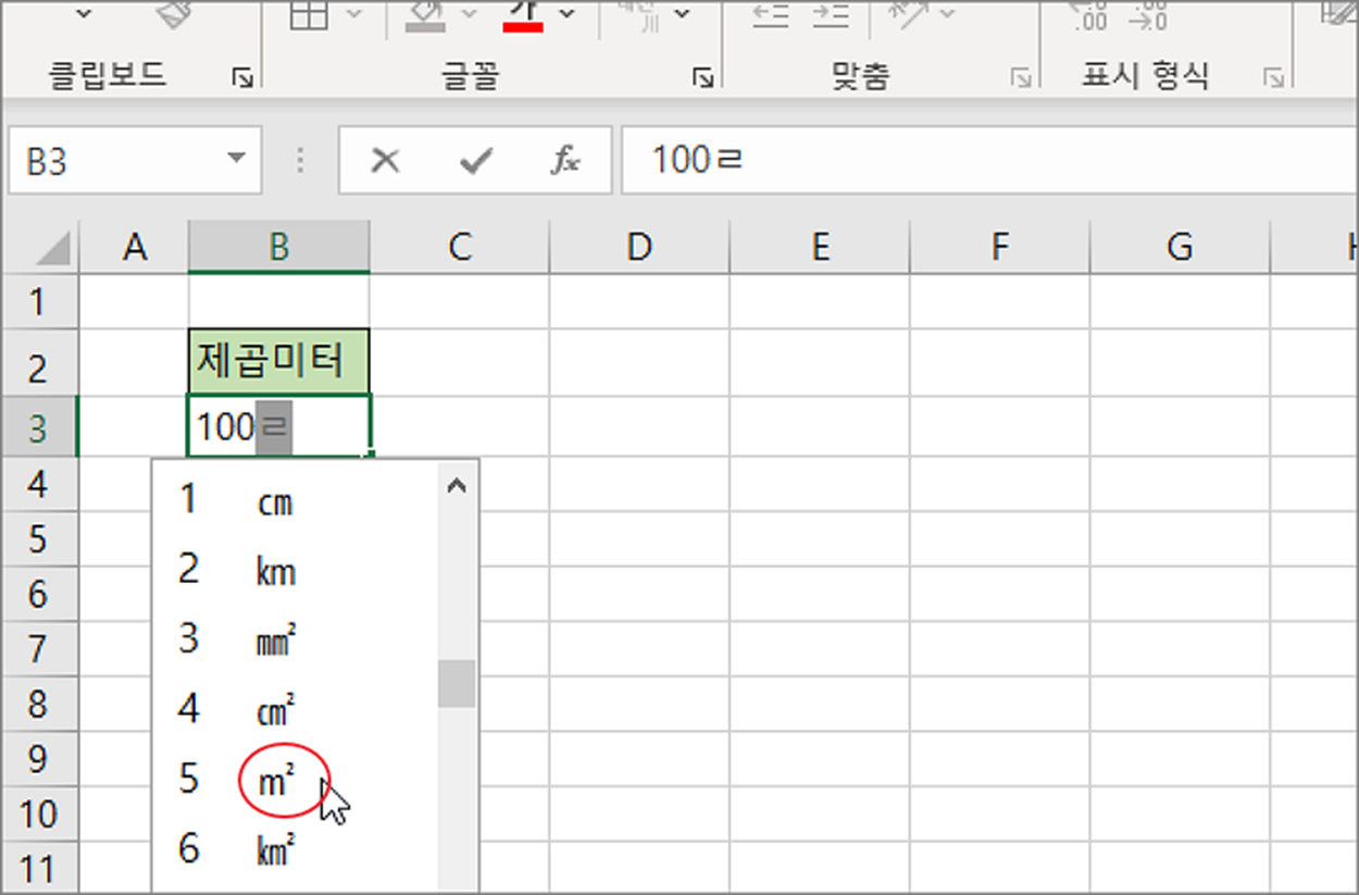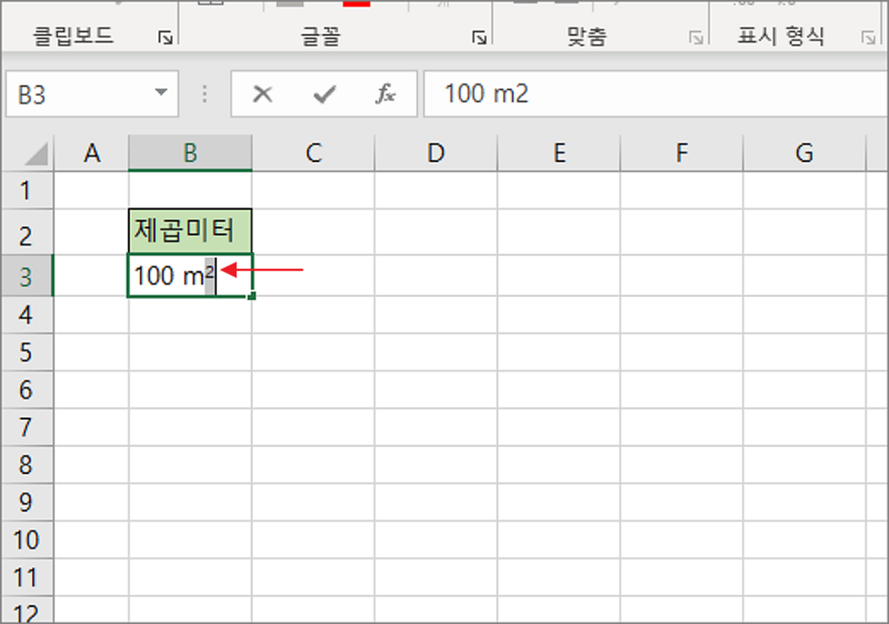 엑셀에는 워드와 달리 위첨자, 아래첨자 를 추가할 수 있는 리본 메뉴가 없습니다. 하지만 방법은 여러가지입니다. 셀 서식이나 특수 문자를 이용해서 제곱미터를 표시해 보겠습니다.
