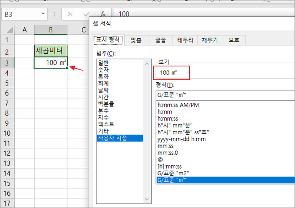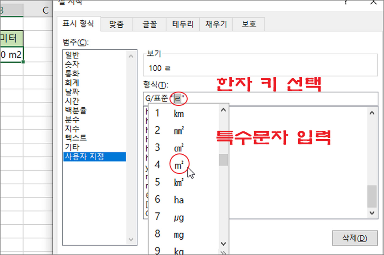 ▼ 셀 서식 창에서 범주 > 사용자 지정 으로 이동합니다. 그리고 형식에서 “G/표준” 뒤에 “ㄹ” 입력하고 “한자” 키를 눌러 특수문자 목록을 띄웁니다. 목록에서 m2 를 선택합니다.