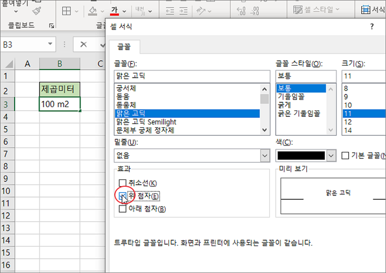| ◎ 위첨자로 제곱미터 표시하기 |