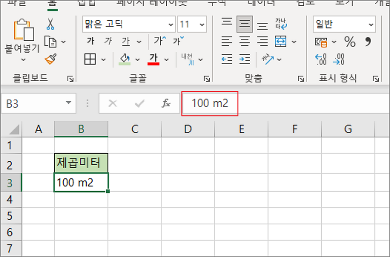 ▼ 결과는 다음과 같습니다. 변경한 셀 서식을 통해 제곱미터 표시가 화면에 나타납니다.
